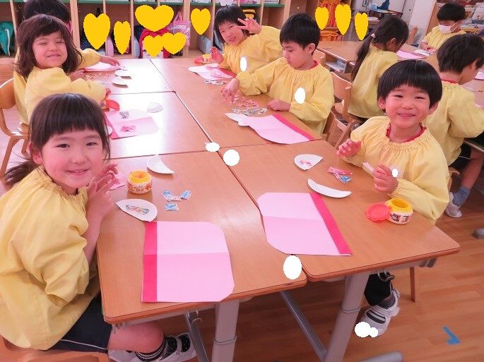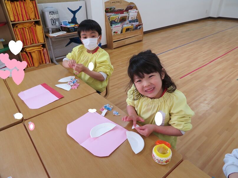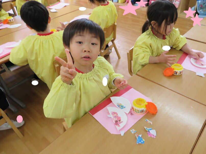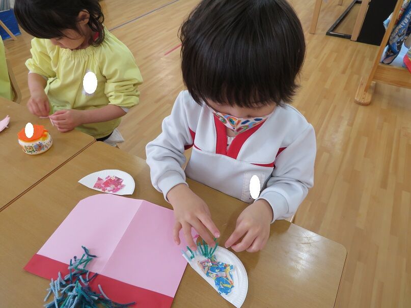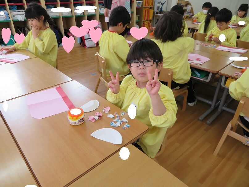 ひなまつり製作 2020年02月20日 ひなまつり製作をしました 折り紙をちぎって糊付け、終わったらボンドの上に毛糸を貼り付けて行きました。始まる前はニコニコしていましたが、始まると真剣カメラを向けても黙々と製作していました。製作大好きなひばり組さんです次回は笑顔の写真を載せたいと思います