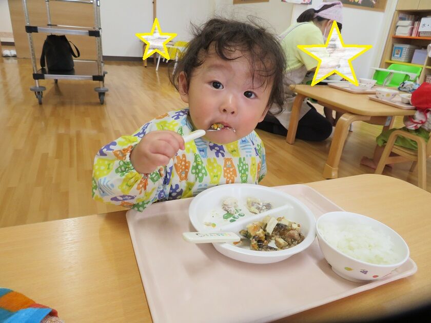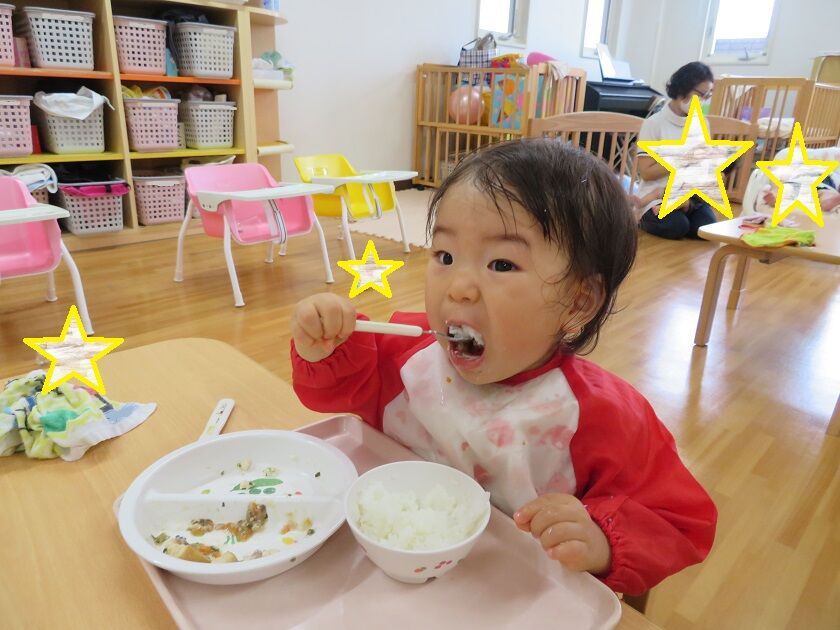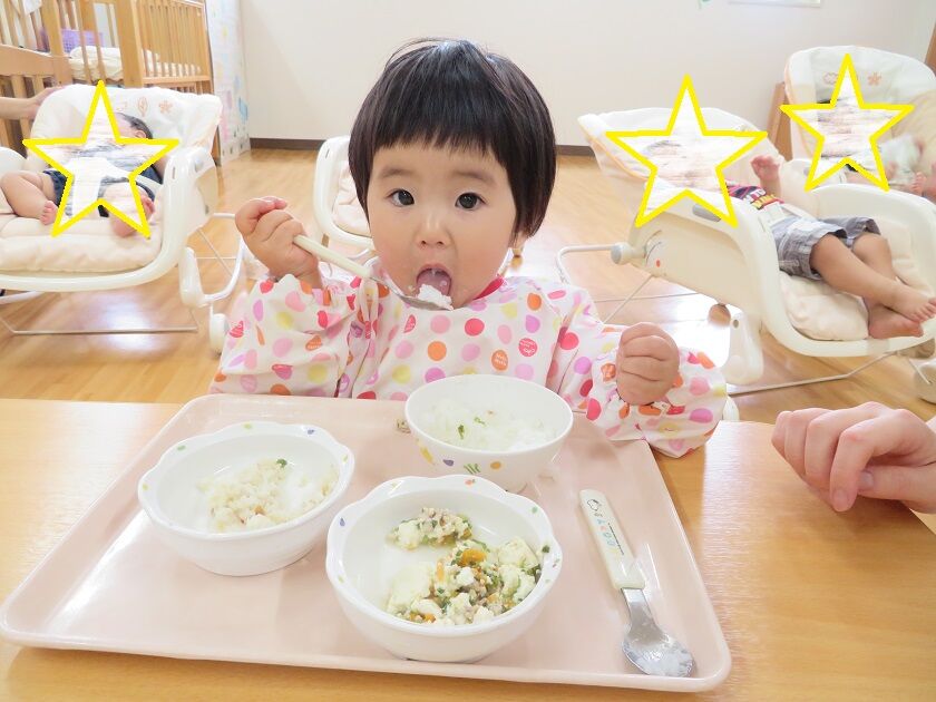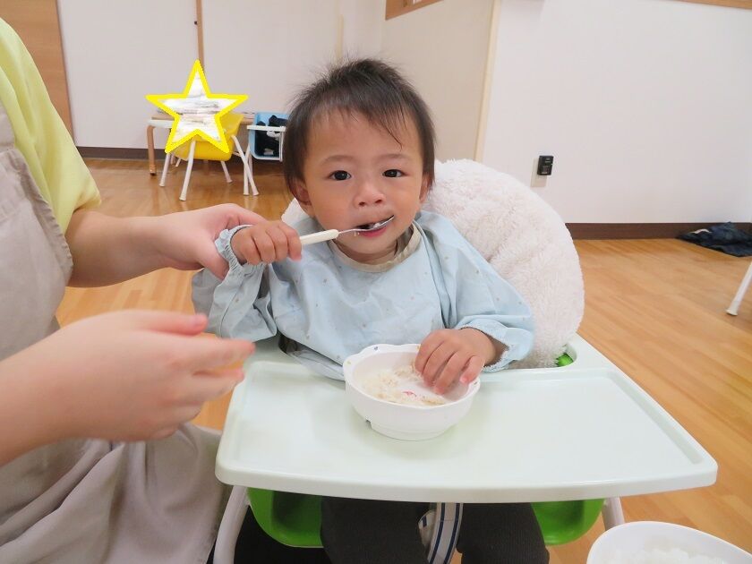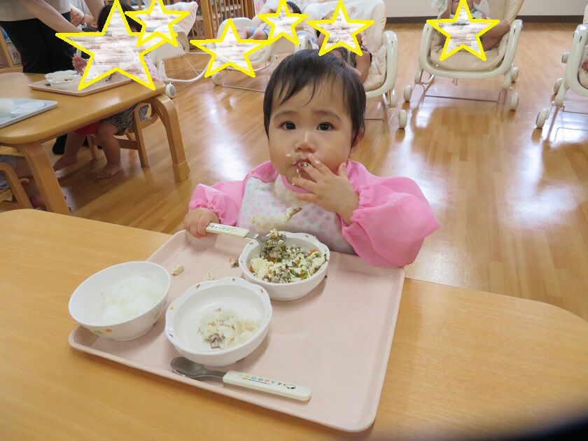 ひよこ組☆給食 2022年07月30日 7月から2人のお友だちが加わり、ひよこ組は15名になりました今回は、給食の様子です 保育者に手を添えてもらいながら、スプーンを使って食べる事を少しずつ覚えてきたひよこ組さん大きな口を開けて頑張って食べていますっ