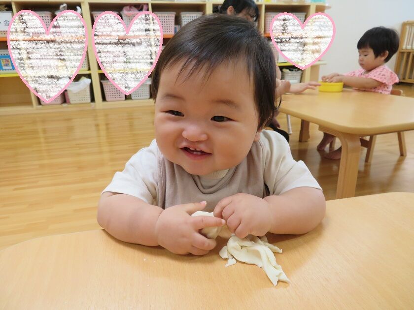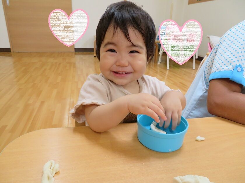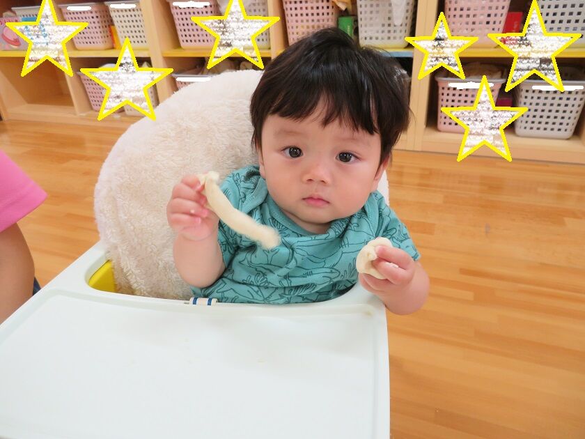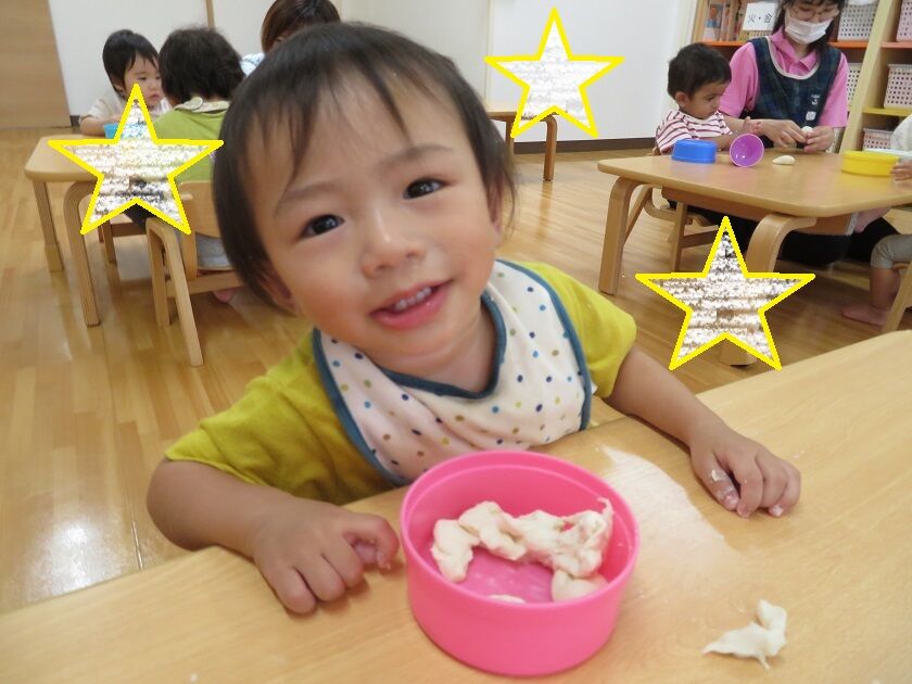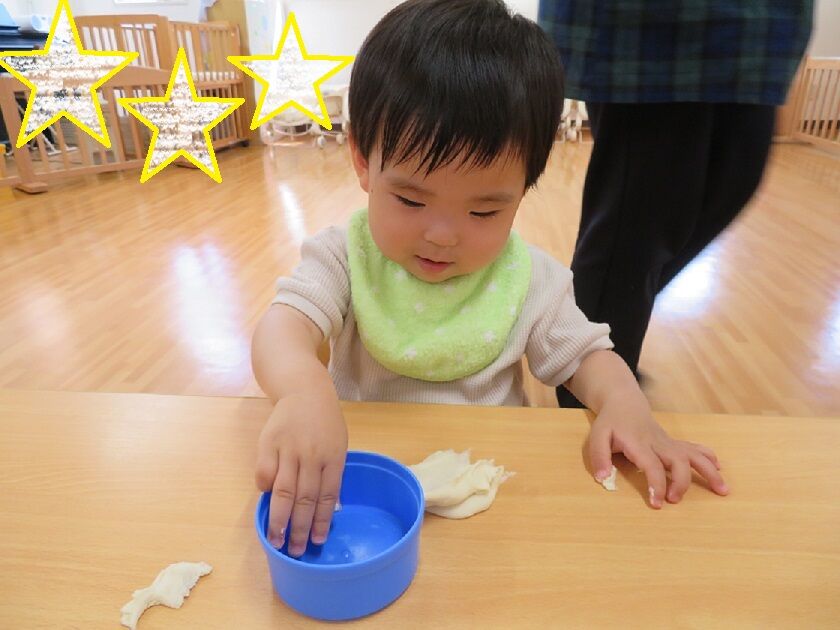 ひよこ組☆初めての小麦粉粘土! 2022年09月28日 こんにちは今回は、小麦粉粘土で遊んでいる様子をお届けします初めは不思議そうにじっと見つめていたり、早く遊びたいと手を伸ばしたりする子もいました!ツンツンと触ってみたり、ビヨーンとのばしてみたりと感触を楽しんでいました カップに小麦粉粘土を入れてニコニコ嬉しそうです 初めて小麦粉粘土を触ってキラキラスマイルなひよこ組さんでした