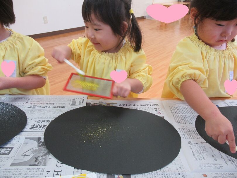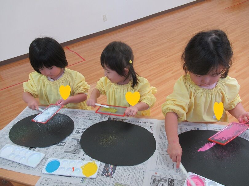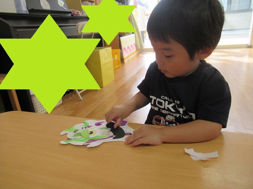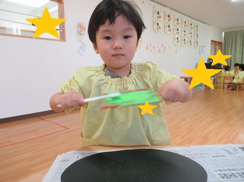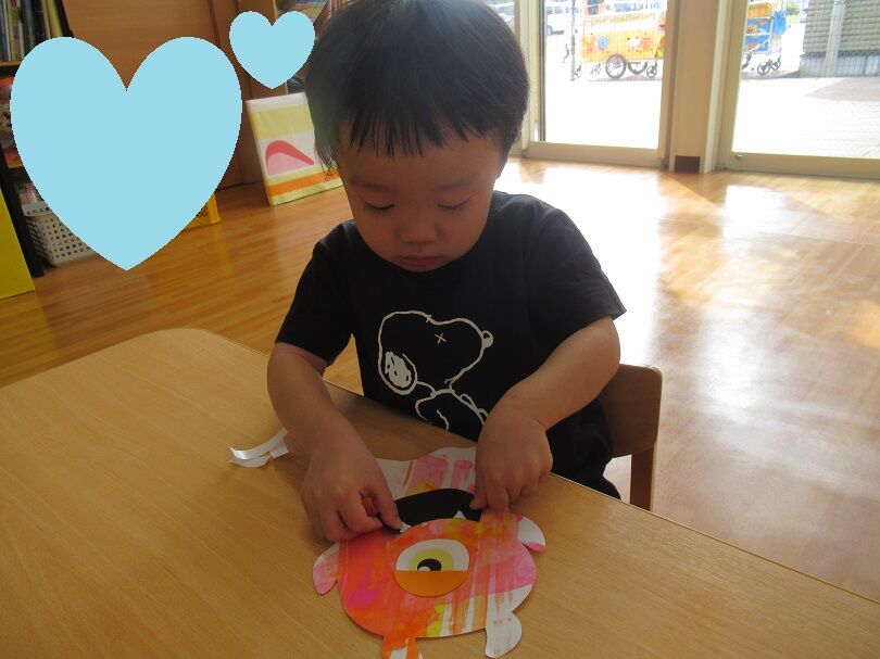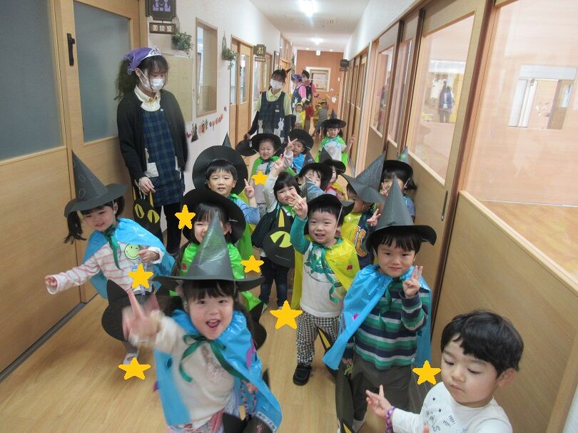 かるがも組♪ハロウィン製作♪ 2023年11月04日2023年10月31日 ハロウィンマントとバックの製作の様子です スパッタリングで絵の具を飛ばして画用紙に色を付けたり、 マントに貼るお化けの顔を貼ったりしました 完成すると「みてみて」と嬉しそうに見せてくれるかるがも組さんでした ハロウィン集会では、「トリックオアトリート」と言ってお菓子をもらい、 お友達とお菓子を見せ合って喜んでいました