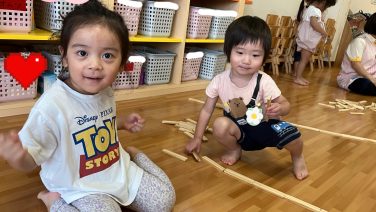 お部屋で絵の具遊びをしました!好きな色の絵の具を選んで両手に付けて模造紙にペタン!!「わ~!みて~!...
