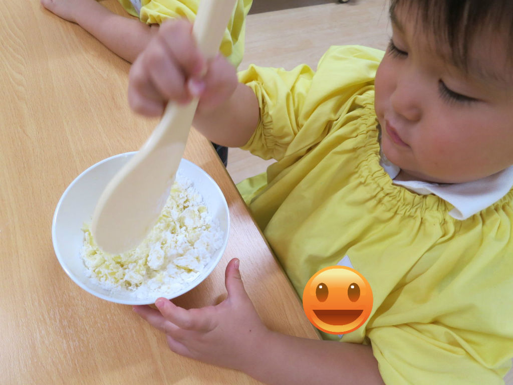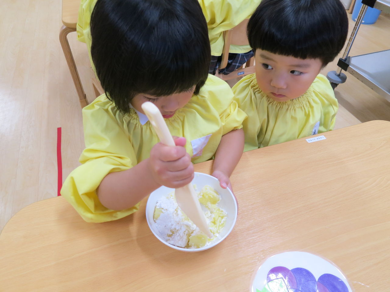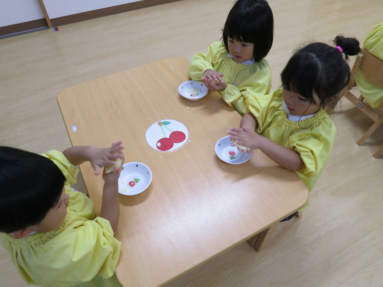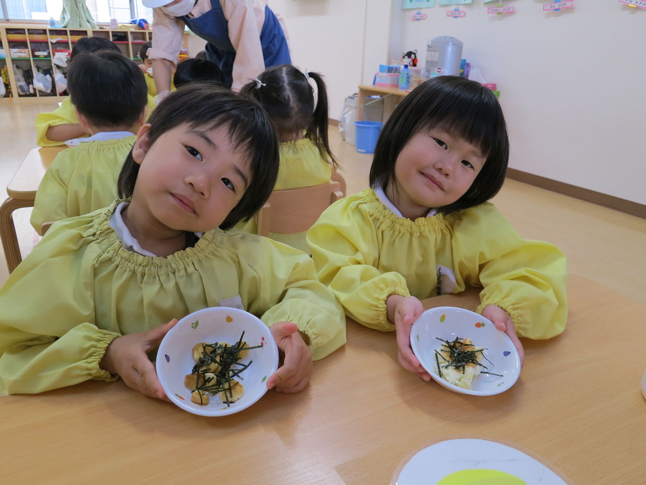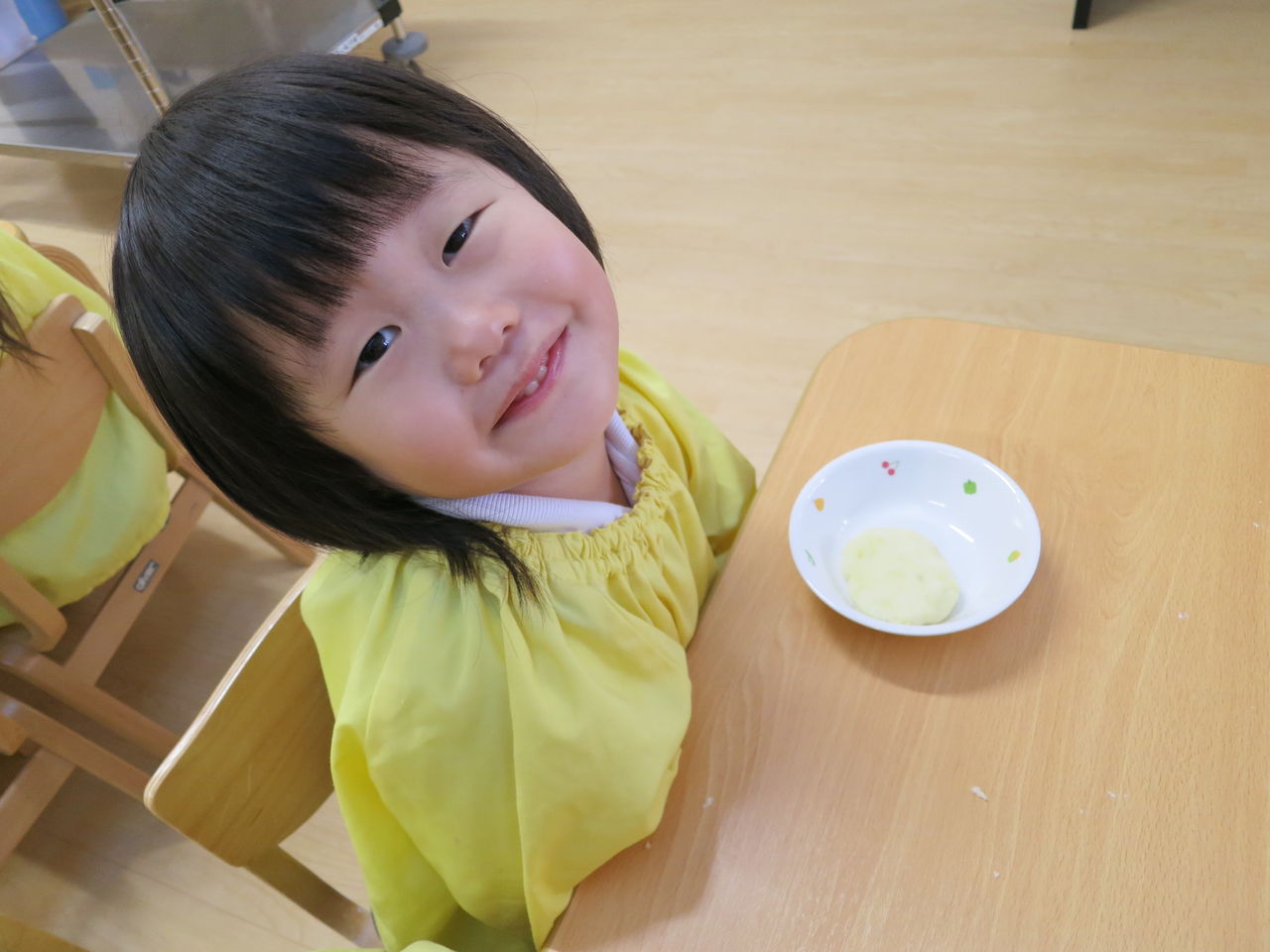 ☆クッキング保育☆ こじか組 2016年06月21日 こんにちは こじか組です 6月17日(金)の午後のおやつにクッキングをしました 何を作ったかと言うと…ポテトもちです まずは、給食の先生のお話を聞きますみんな真剣に聞いています じゃがいもには、ビタミンCがあるんだそうです蒸かしたじゃがいもに片栗粉を入れてしゃもじで混ぜます こぼさないように・・・白い粉がなくなるように・・・ 小判状に手で丸めます 上手に丸められたね 味付けは、お醤油ですスプーンでぬりぬり そして、給食室に移動して大きなオーブンへ入れる所を見学ですしっかり入りました! じ~~~~みんな窓から興味津々で見ていますね可愛らしい 美味しそうに焼けました 最後にまた、お醤油を塗って・・・ きざみのりを振りかければ、完成~~~~~~~ のりかけすぎたけど・・・ま、いっか いただきまーすっ あれれなんか出てますよ(笑)みんな「おいしい」と頬張ってました 自分で作ったおやつは、美味しいねっ 次回のクッキング保育は、9月を予定しています。お楽しみに~~