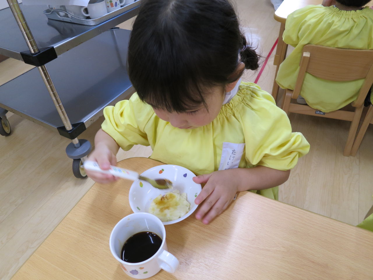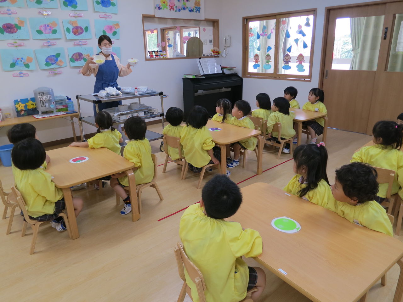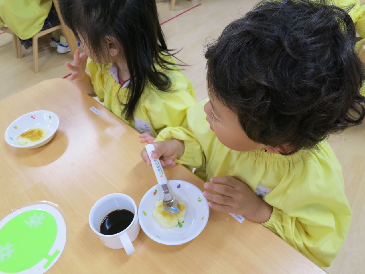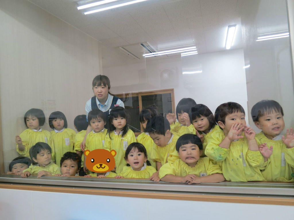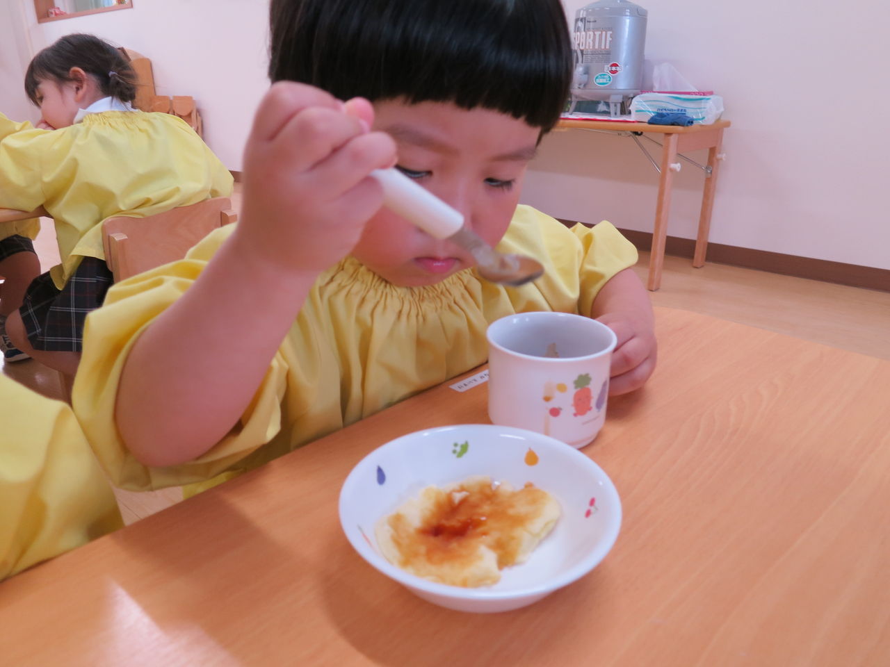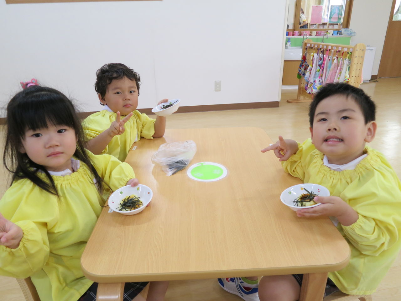 ☆クッキング保育☆ こじか組 2016年06月21日 こんにちは こじか組です 6月17日(金)の午後のおやつにクッキングをしました 何を作ったかと言うと…ポテトもちです まずは、給食の先生のお話を聞きますみんな真剣に聞いています じゃがいもには、ビタミンCがあるんだそうです蒸かしたじゃがいもに片栗粉を入れてしゃもじで混ぜます こぼさないように・・・白い粉がなくなるように・・・ 小判状に手で丸めます 上手に丸められたね 味付けは、お醤油ですスプーンでぬりぬり そして、給食室に移動して大きなオーブンへ入れる所を見学ですしっかり入りました! じ~~~~みんな窓から興味津々で見ていますね可愛らしい 美味しそうに焼けました 最後にまた、お醤油を塗って・・・ きざみのりを振りかければ、完成~~~~~~~ のりかけすぎたけど・・・ま、いっか いただきまーすっ あれれなんか出てますよ(笑)みんな「おいしい」と頬張ってました 自分で作ったおやつは、美味しいねっ 次回のクッキング保育は、9月を予定しています。お楽しみに~~