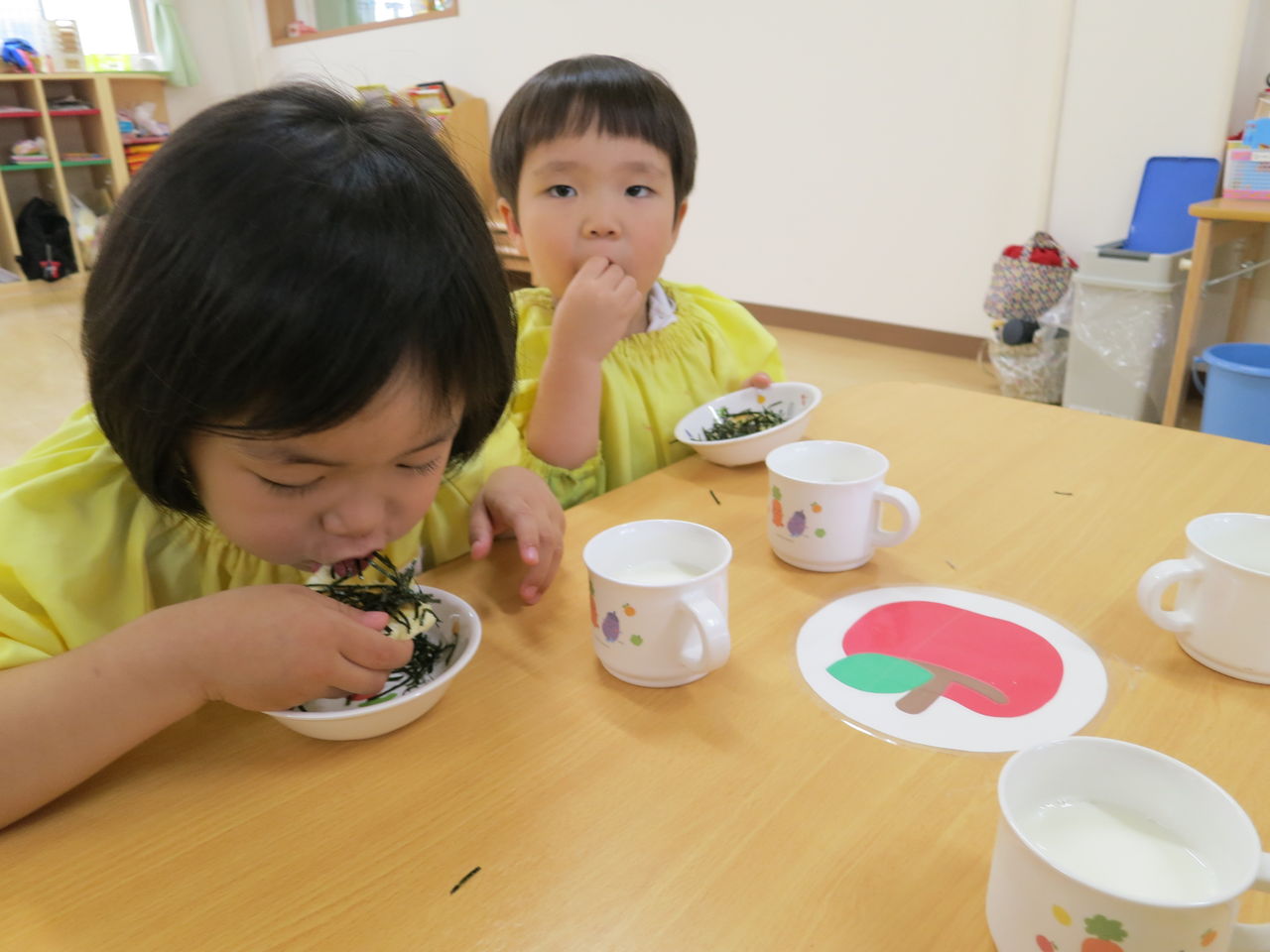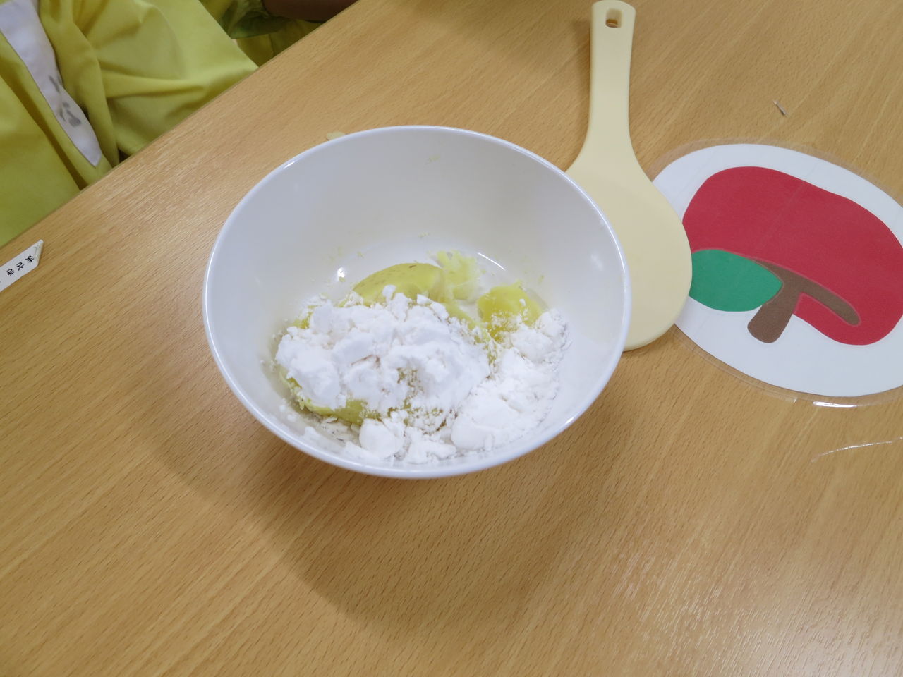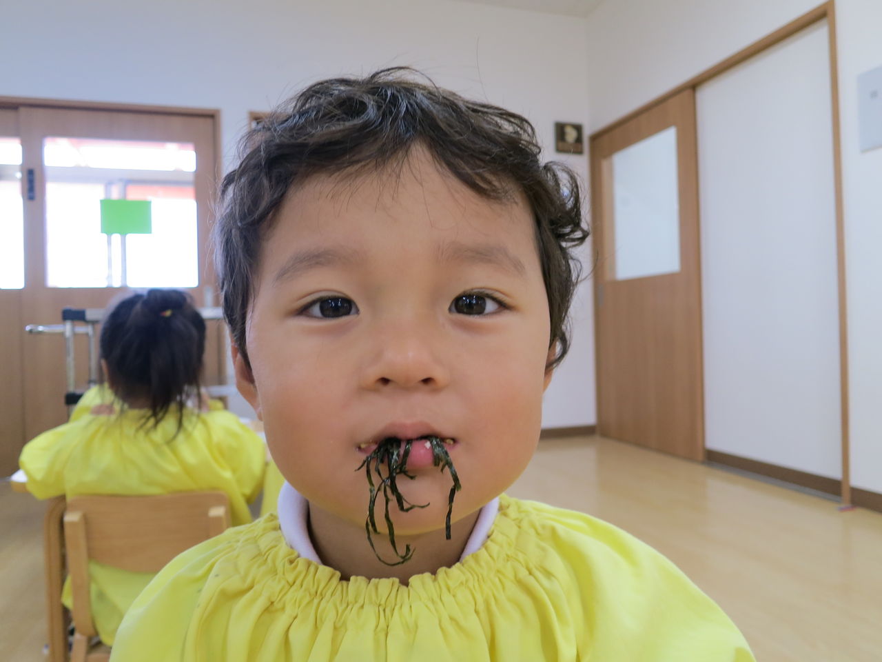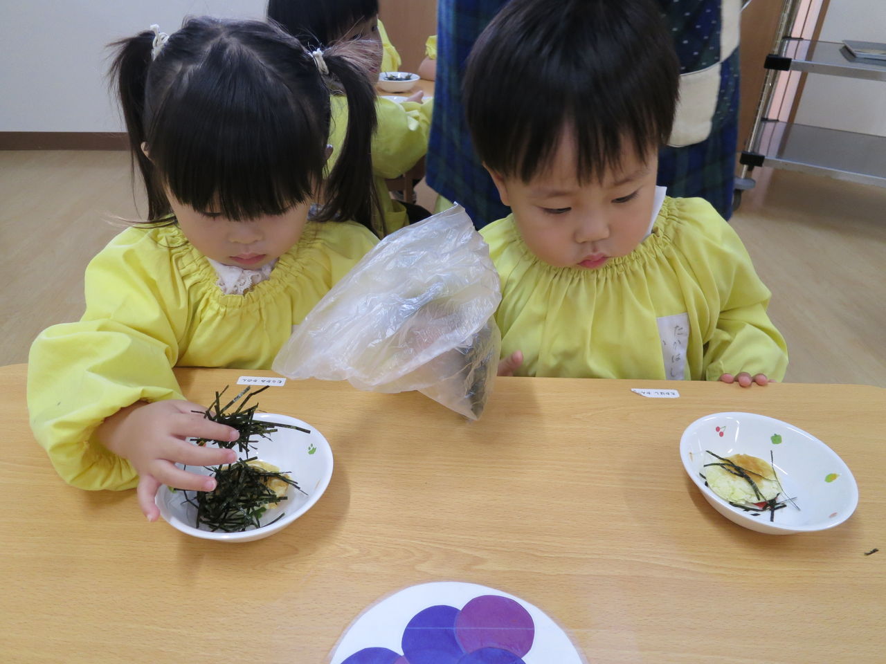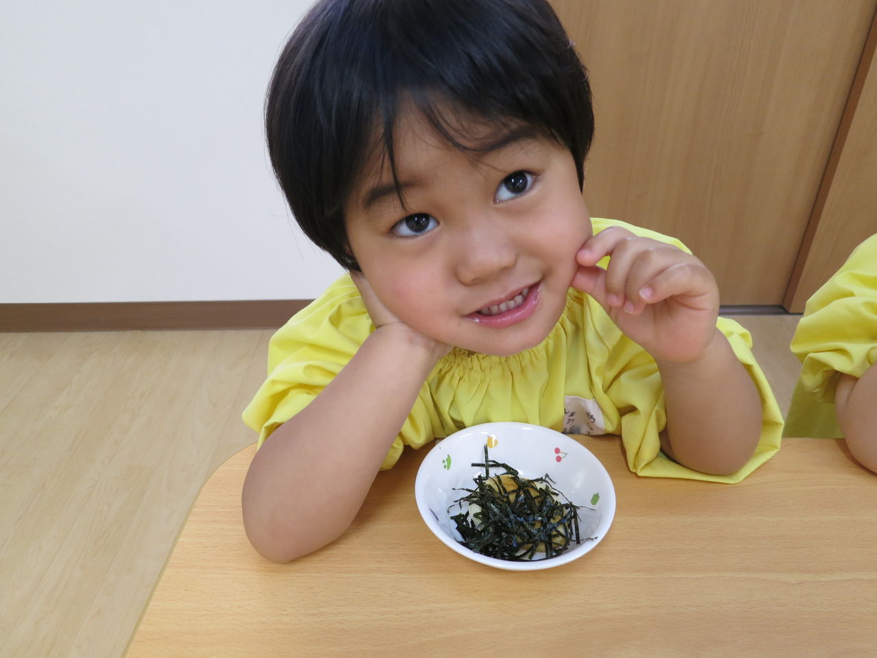 ☆クッキング保育☆ こじか組 2016年06月21日 こんにちは こじか組です 6月17日(金)の午後のおやつにクッキングをしました 何を作ったかと言うと…ポテトもちです まずは、給食の先生のお話を聞きますみんな真剣に聞いています じゃがいもには、ビタミンCがあるんだそうです蒸かしたじゃがいもに片栗粉を入れてしゃもじで混ぜます こぼさないように・・・白い粉がなくなるように・・・ 小判状に手で丸めます 上手に丸められたね 味付けは、お醤油ですスプーンでぬりぬり そして、給食室に移動して大きなオーブンへ入れる所を見学ですしっかり入りました! じ~~~~みんな窓から興味津々で見ていますね可愛らしい 美味しそうに焼けました 最後にまた、お醤油を塗って・・・ きざみのりを振りかければ、完成~~~~~~~ のりかけすぎたけど・・・ま、いっか いただきまーすっ あれれなんか出てますよ(笑)みんな「おいしい」と頬張ってました 自分で作ったおやつは、美味しいねっ 次回のクッキング保育は、9月を予定しています。お楽しみに~~