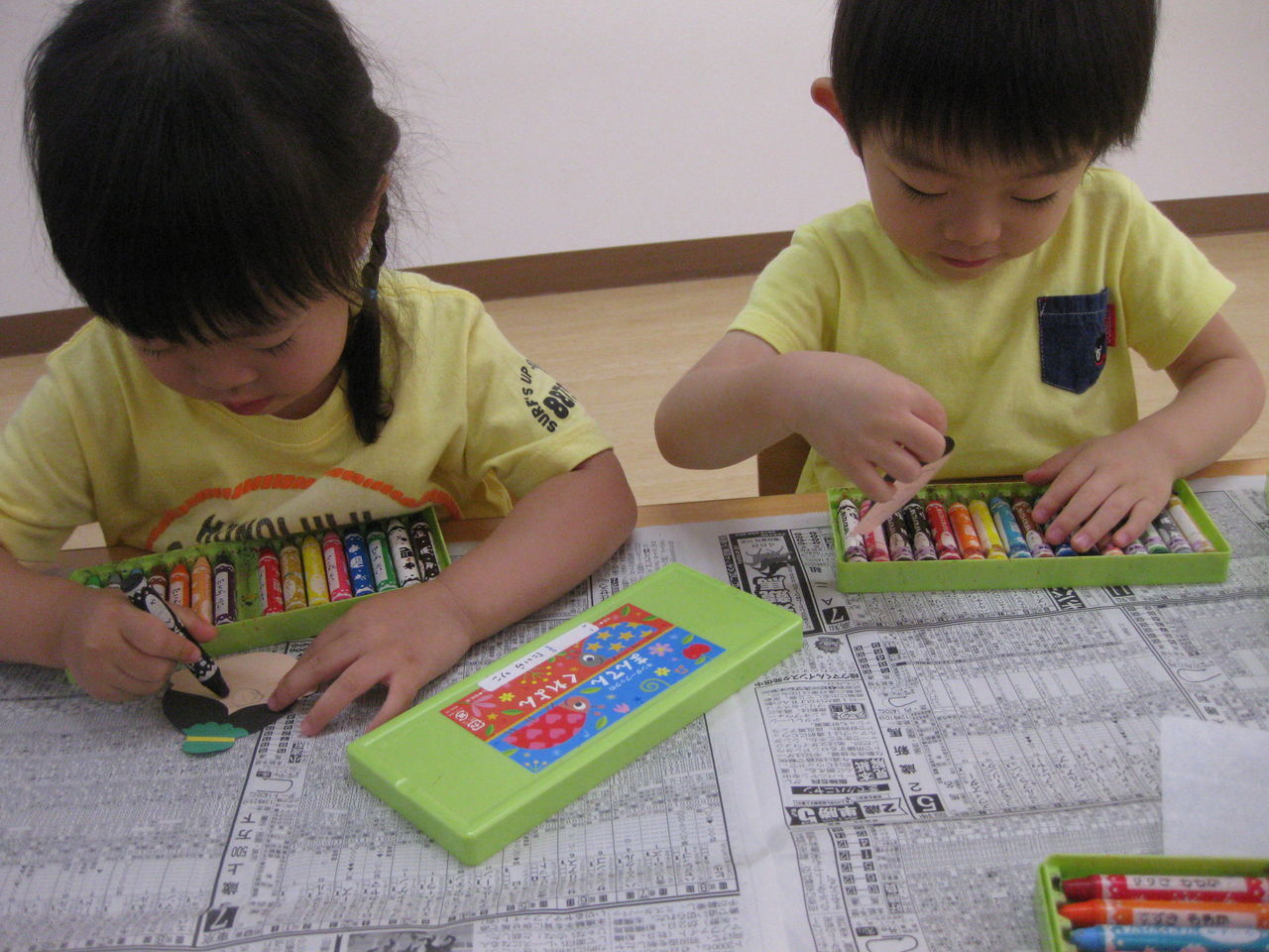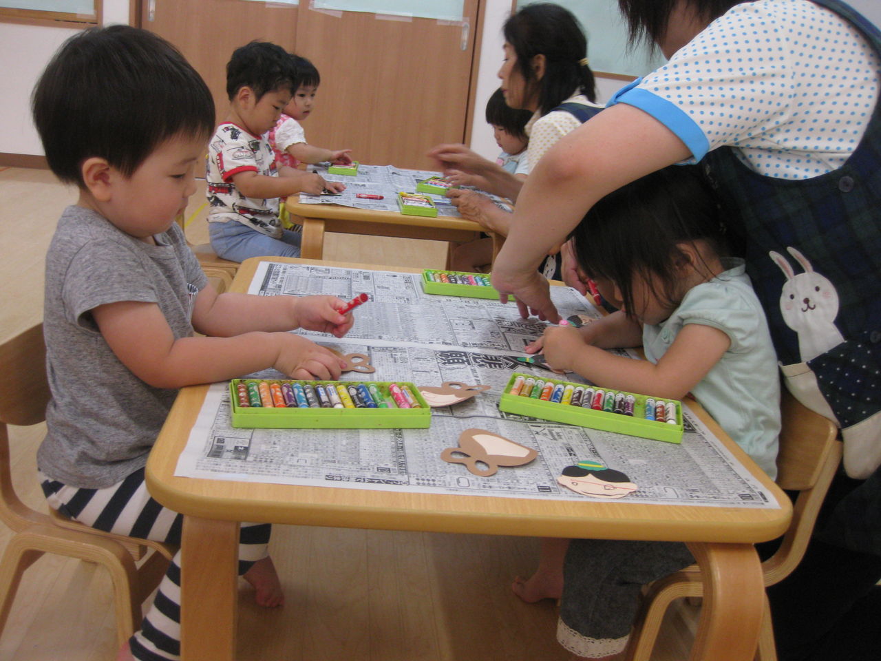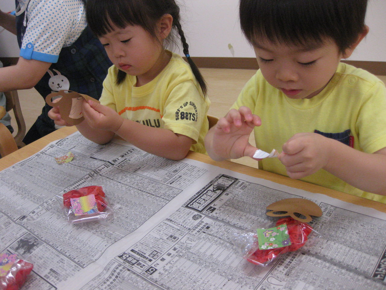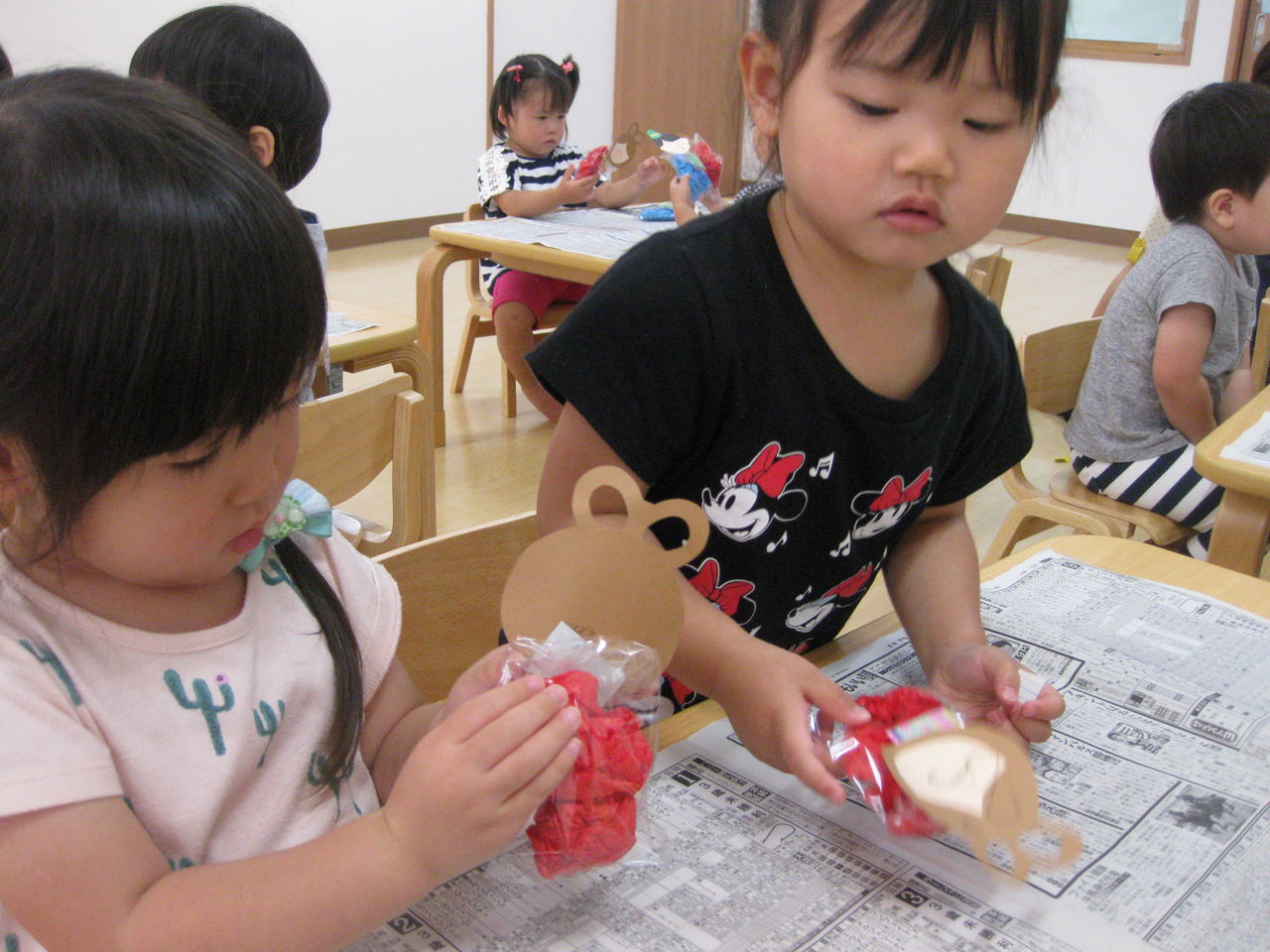 うさぎぐみ☆七夕製作 2018年07月18日 こんにちはうさぎぐみです今回は保育参観で行った七夕の製作の様子をお伝えしますまずは、織り姫と彦星の顔を描いていきます最近は、顔のパーツをキチンとした位置に描くことが出来るようになってきました次に織り姫と彦星の身体となる部分を作っていきます花紙を上手に丸めて袋詰めをしていきますとっても上手に出来たでしょ最後、お洋服にシールをぺったんして顔を付けて完成とっても上手に出来ました次回もお楽しみに 保護者の皆様、保育参観にご参加頂きありがとうございました。