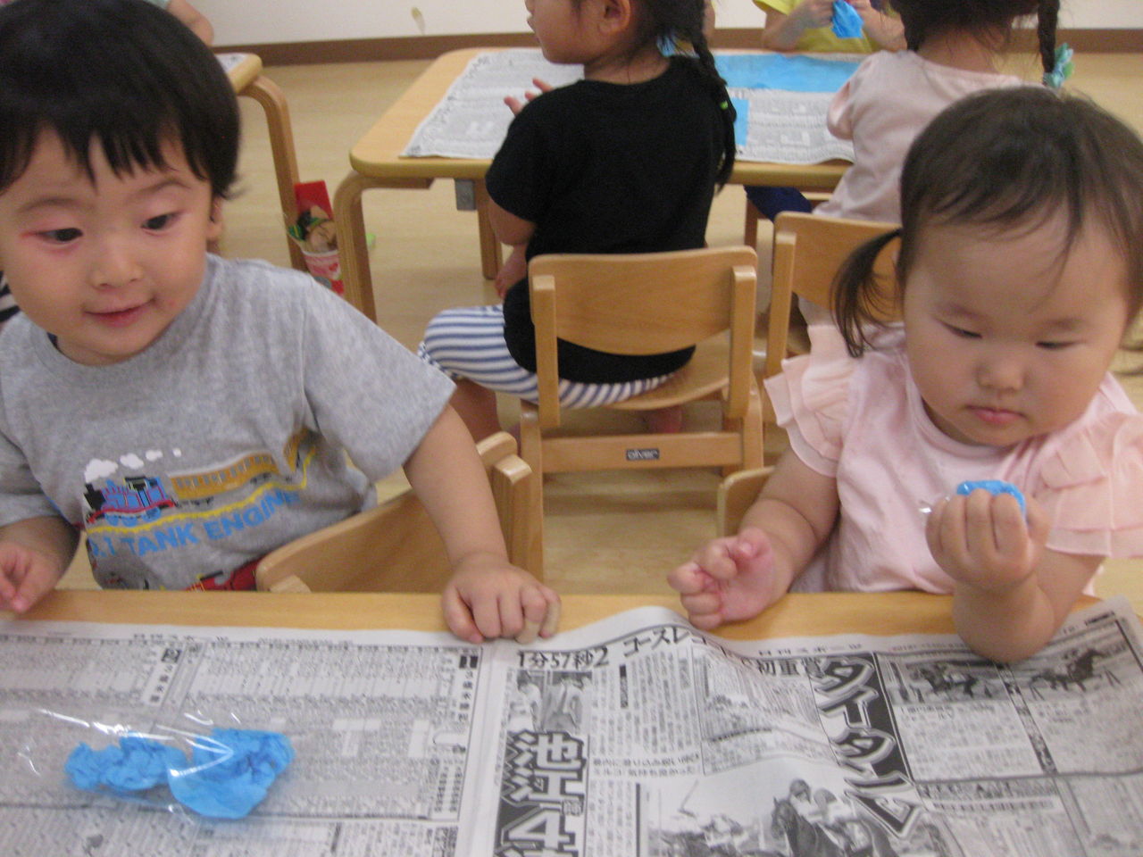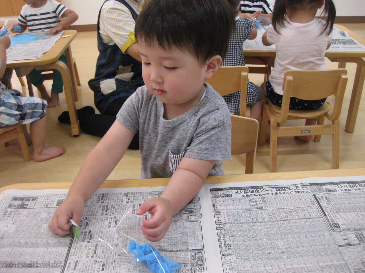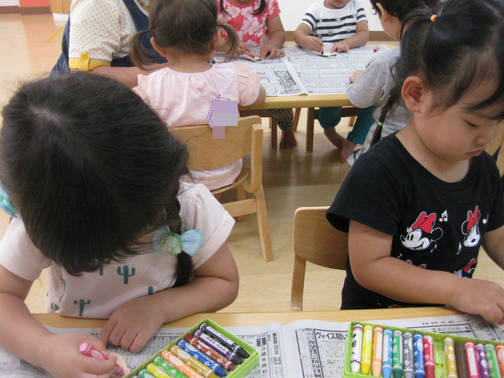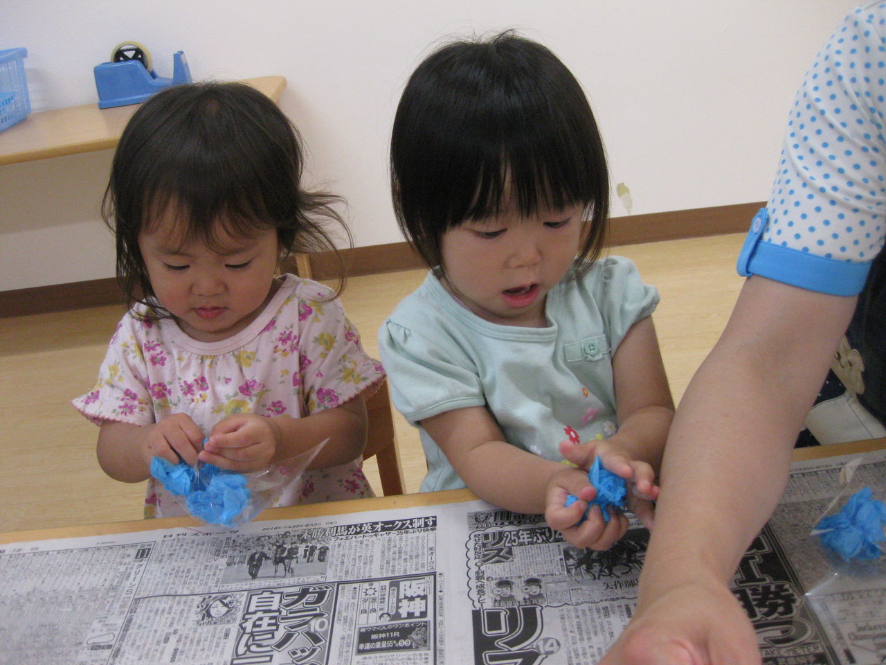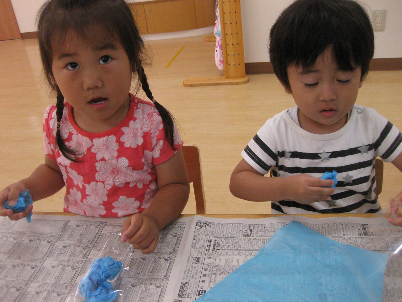 うさぎぐみ☆七夕製作 2018年07月18日 こんにちはうさぎぐみです今回は保育参観で行った七夕の製作の様子をお伝えしますまずは、織り姫と彦星の顔を描いていきます最近は、顔のパーツをキチンとした位置に描くことが出来るようになってきました次に織り姫と彦星の身体となる部分を作っていきます花紙を上手に丸めて袋詰めをしていきますとっても上手に出来たでしょ最後、お洋服にシールをぺったんして顔を付けて完成とっても上手に出来ました次回もお楽しみに 保護者の皆様、保育参観にご参加頂きありがとうございました。