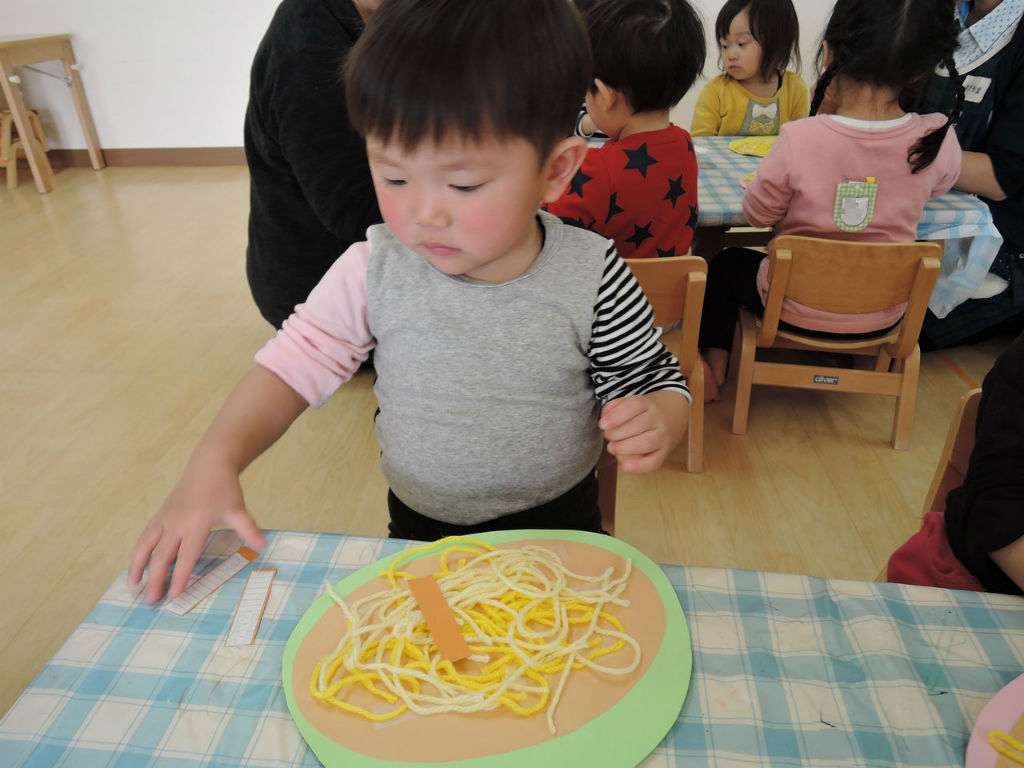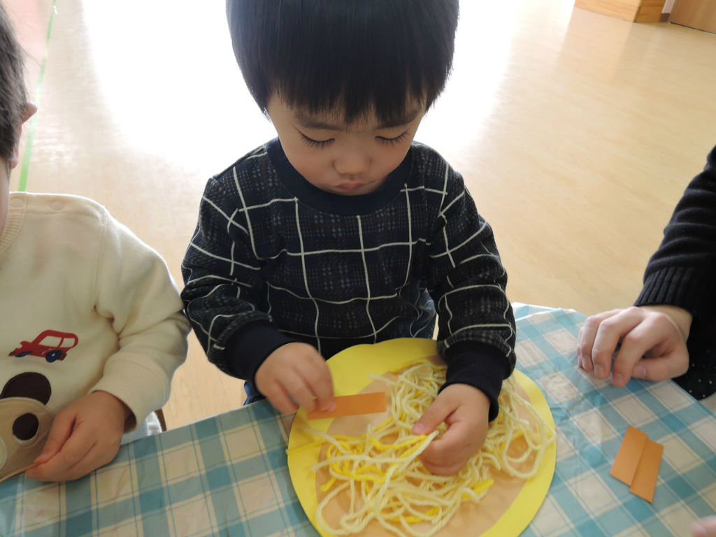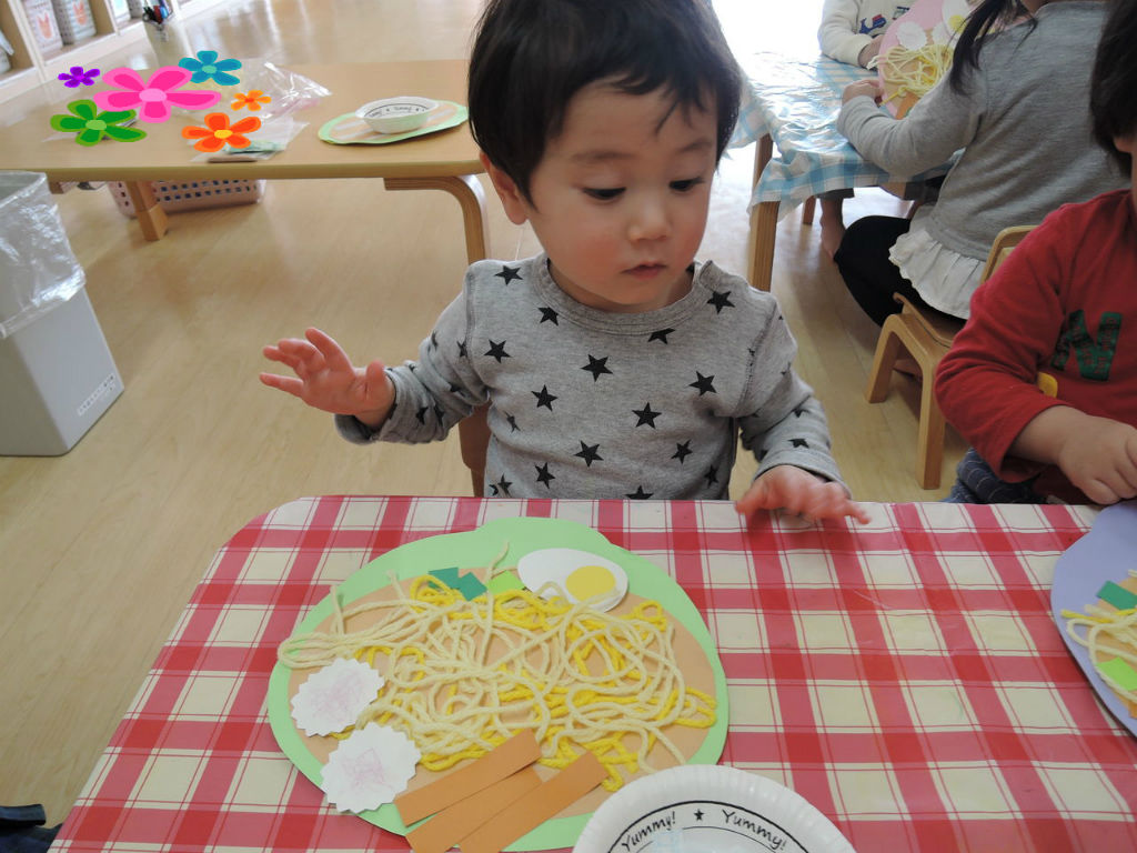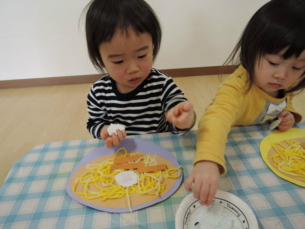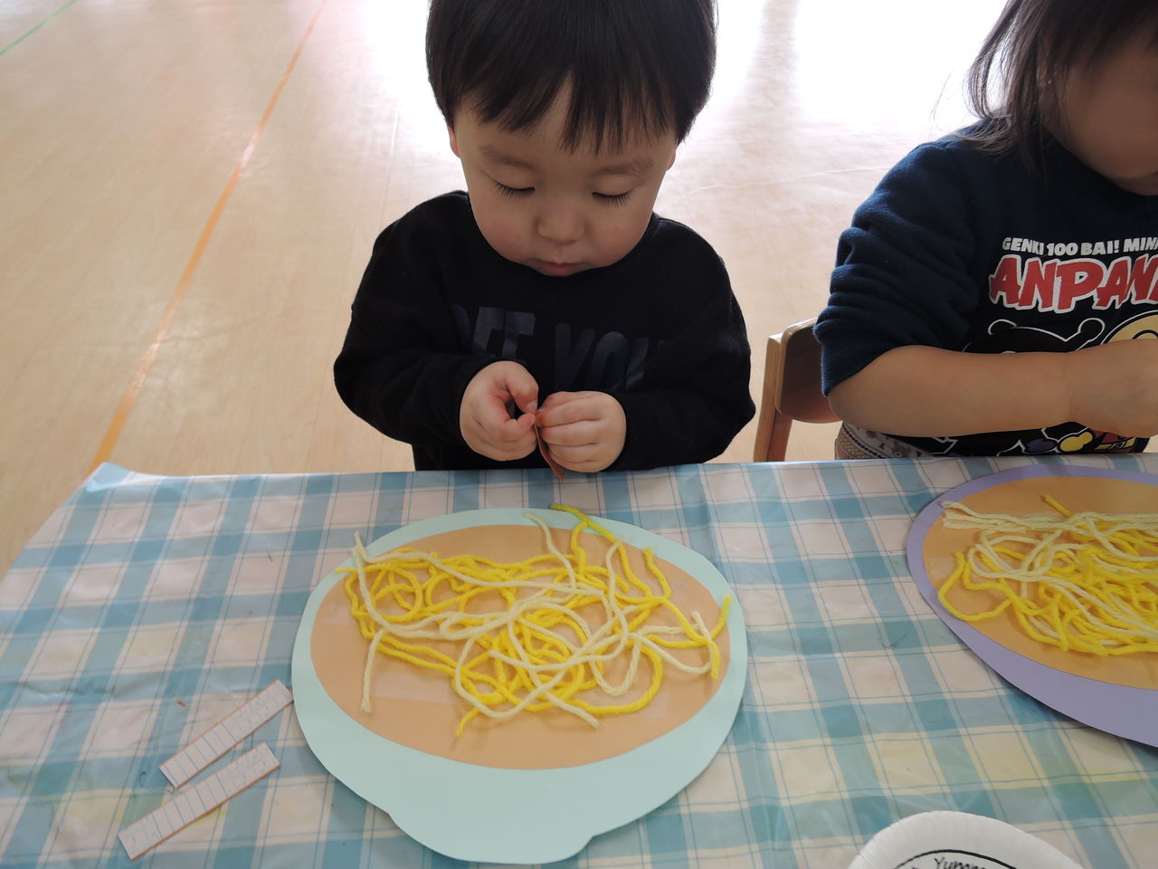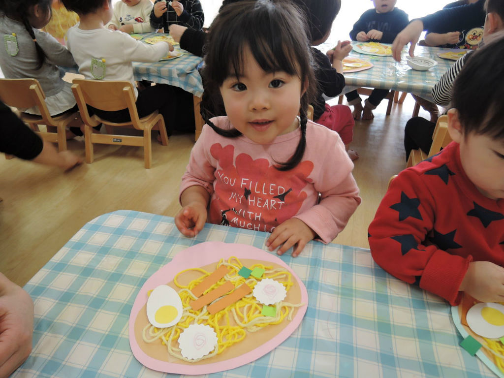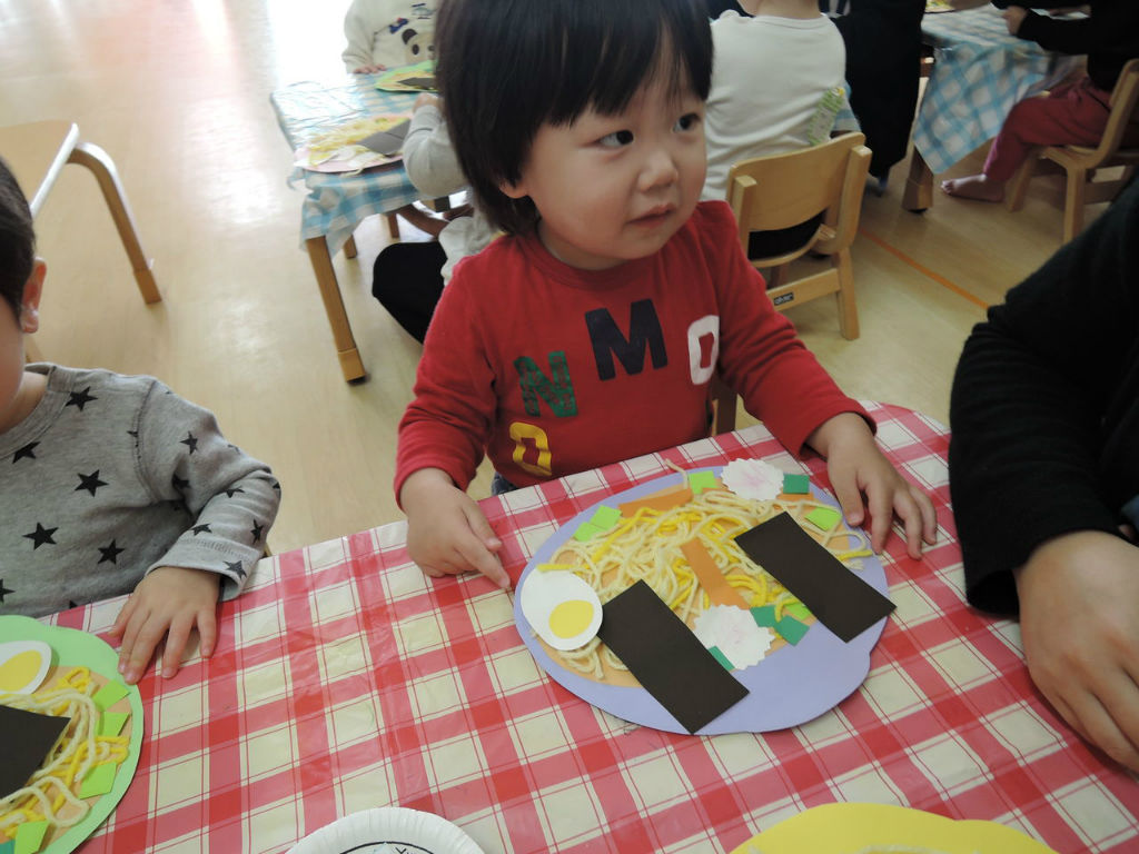 りす組♪製作「ラーメン」 2019年02月07日 皆さん、こんにちわ!(*゚∀゚)っ今回は、ラーメン製作の様子をお伝えします。まずは、ナルトにグルグルと模様を書きます楽しそうですね麺を入れたら・・・タマゴ・メンマ・ナルトをトッピング真剣ですネギは、お好みで( ´∀`)つもっとのせようかな~ドヤッ(・∀・)最後に、海苔をのせたら・・・完成小さな職人さんが、一生懸命作ってくれました(* ̄∇ ̄*)ラーメンはお部屋に飾ります♪お楽しみに!!