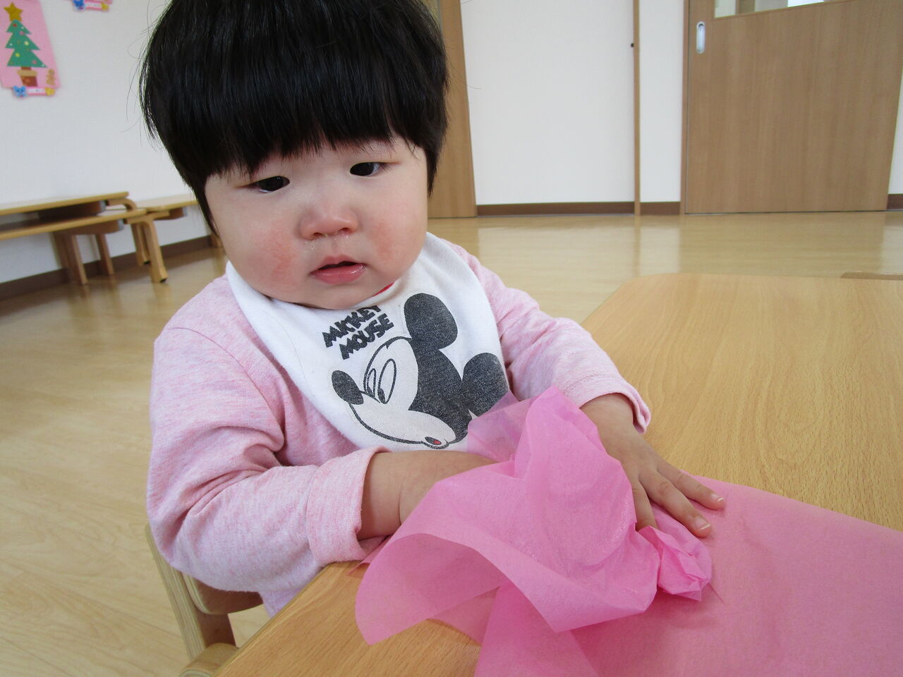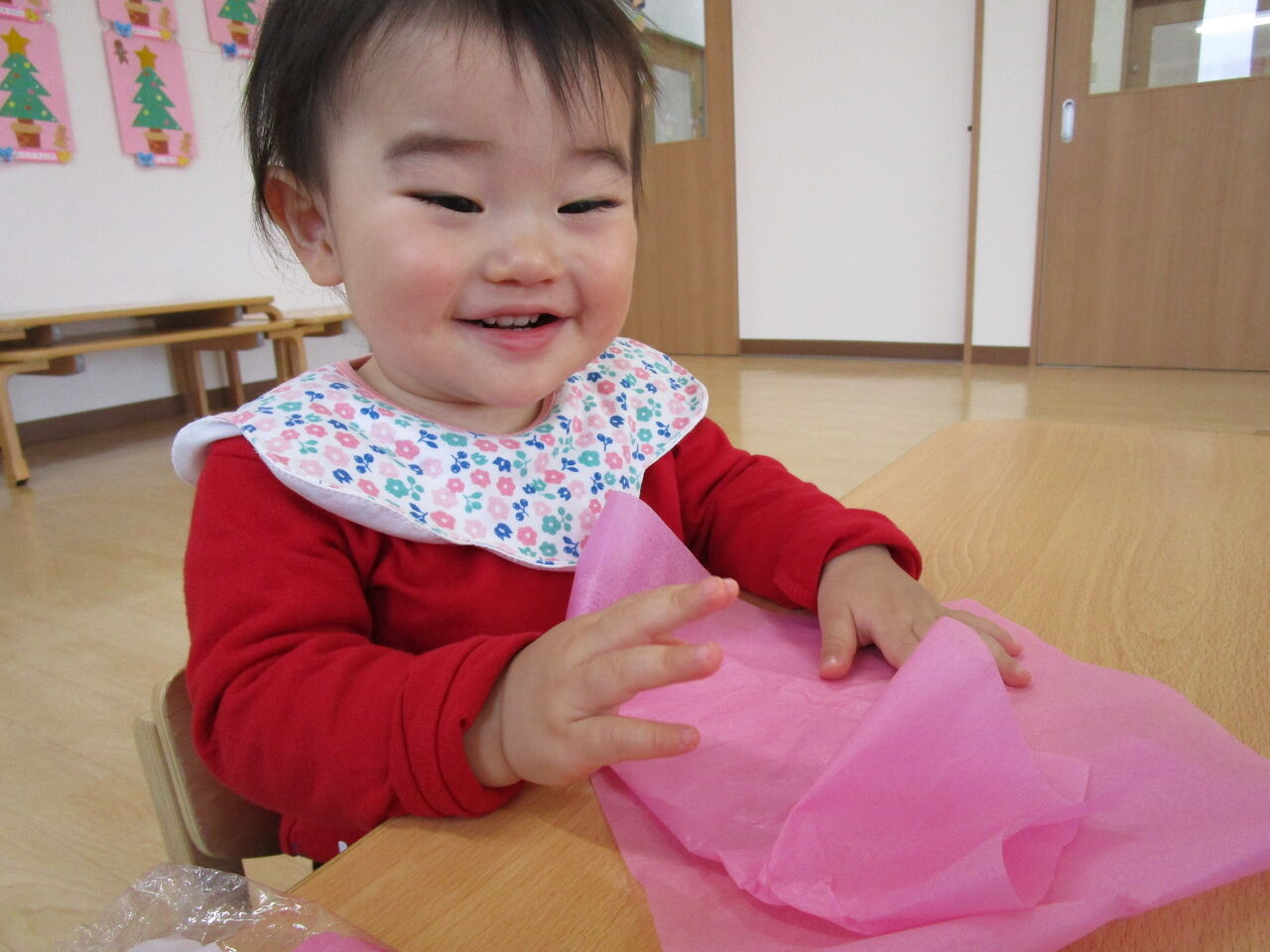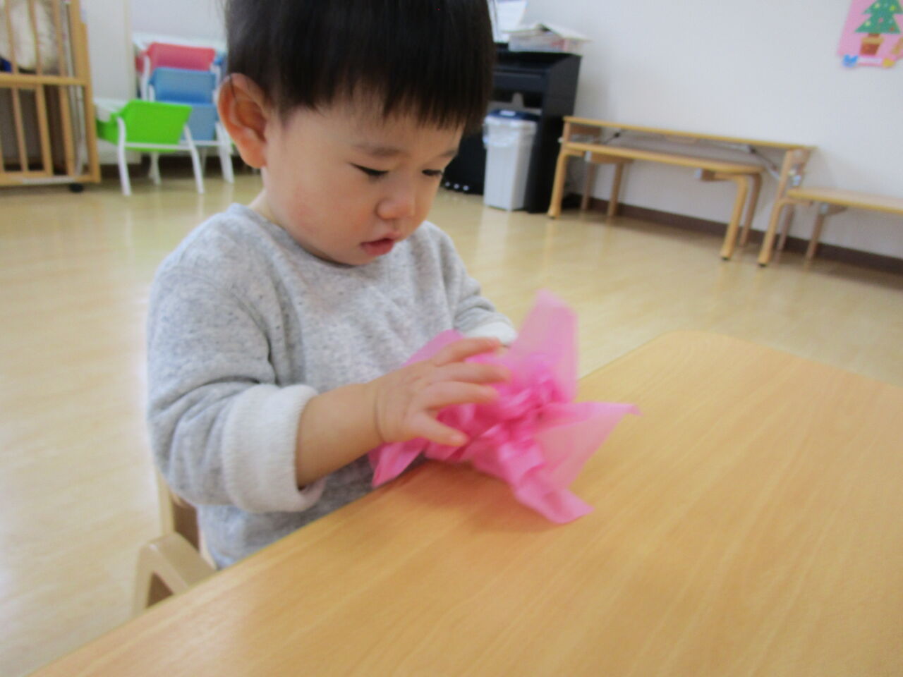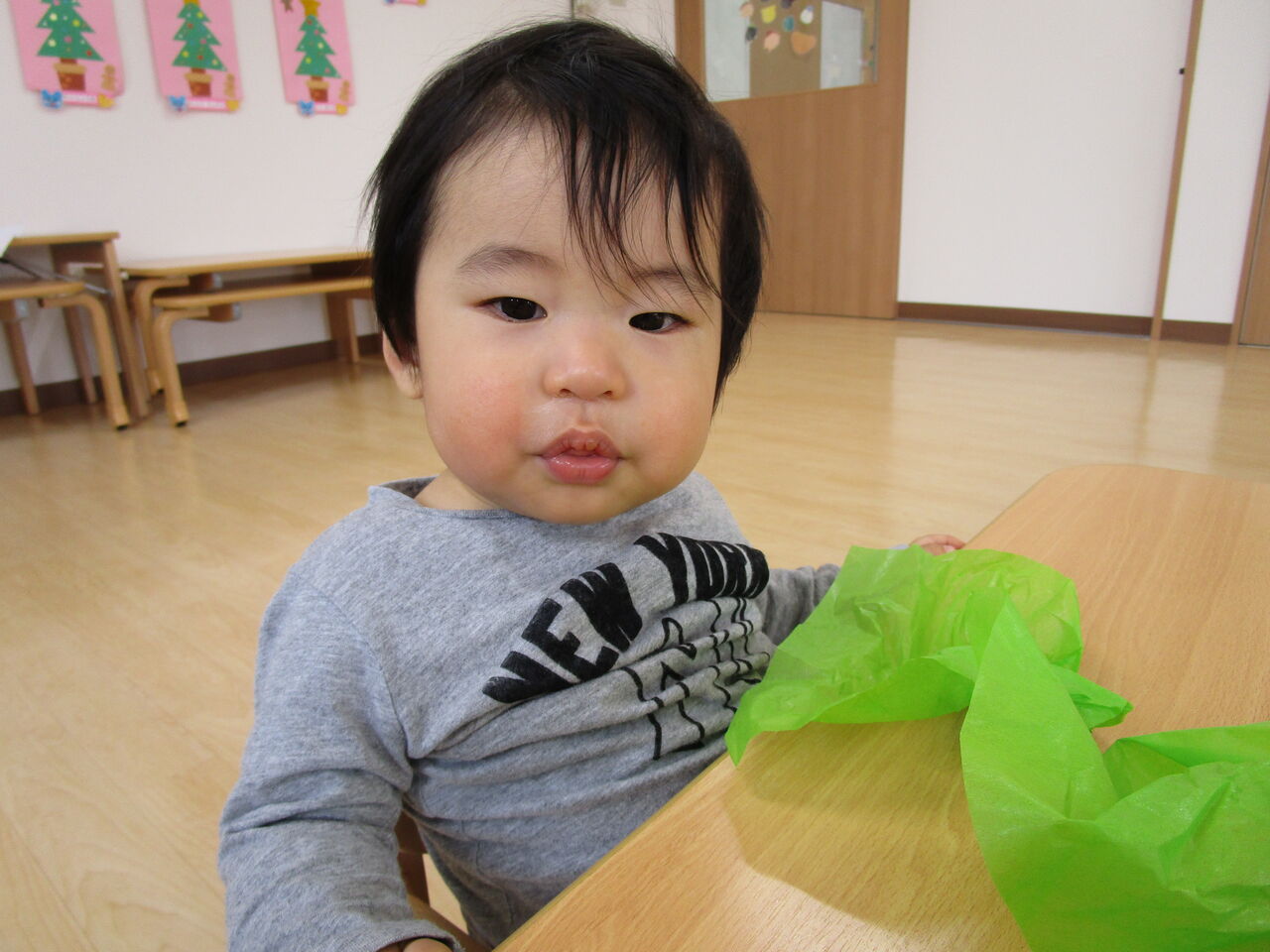 のねずみ組♡クリスマス製作 2019年12月31日 こんにちは今日は、クリスマス製作の様子をお伝えしたいと思います リースは、花紙をクシャクシャに丸めて、袋に入れますクシャ・クシャギュッ・ギュ僕上手にできているかなちょっと触るの怖いな上手にできました美味しそうで、ついつい口元に・・・ 袋に入れたら、点シールをペタペタ貼って、可愛いリースを作ることが出来ました 今年のブログ更新は、今回で最後になります楽しんで頂けましたでしょうか来年も可愛いみんなの様子を伝えていきたいと思います。新年もよろしくお願いします