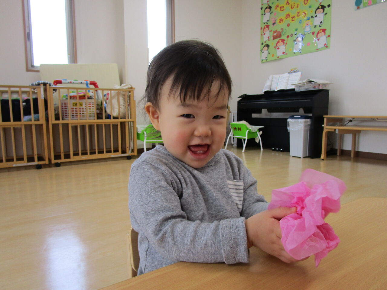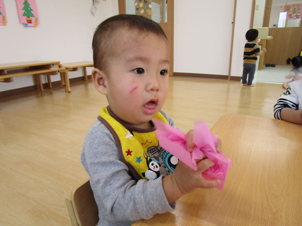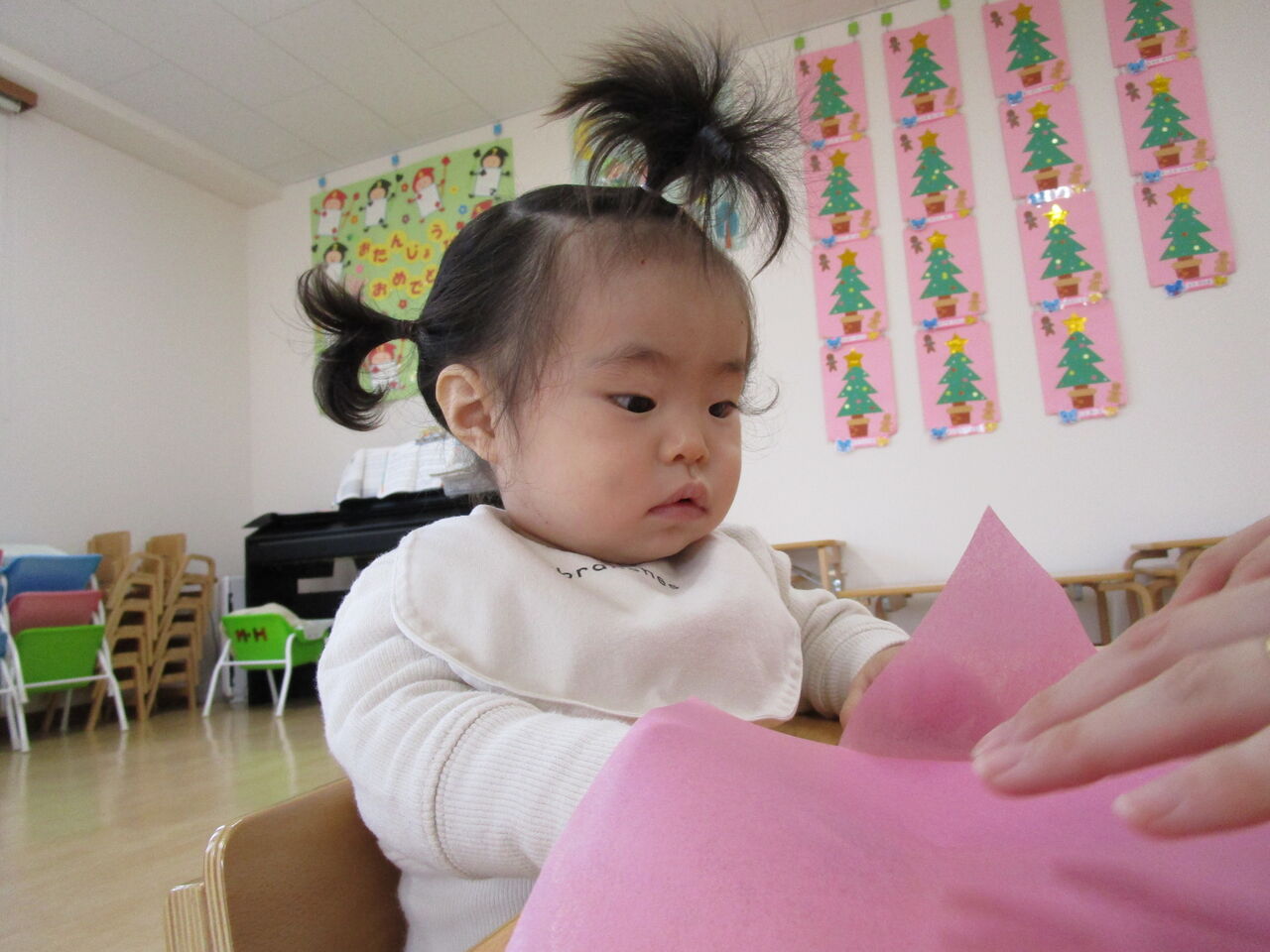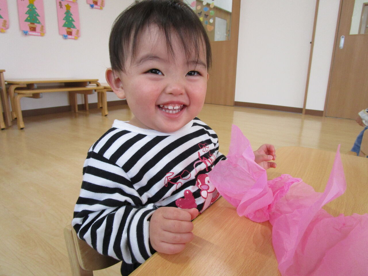 のねずみ組♡クリスマス製作 2019年12月31日 こんにちは今日は、クリスマス製作の様子をお伝えしたいと思います リースは、花紙をクシャクシャに丸めて、袋に入れますクシャ・クシャギュッ・ギュ僕上手にできているかなちょっと触るの怖いな上手にできました美味しそうで、ついつい口元に・・・ 袋に入れたら、点シールをペタペタ貼って、可愛いリースを作ることが出来ました 今年のブログ更新は、今回で最後になります楽しんで頂けましたでしょうか来年も可愛いみんなの様子を伝えていきたいと思います。新年もよろしくお願いします