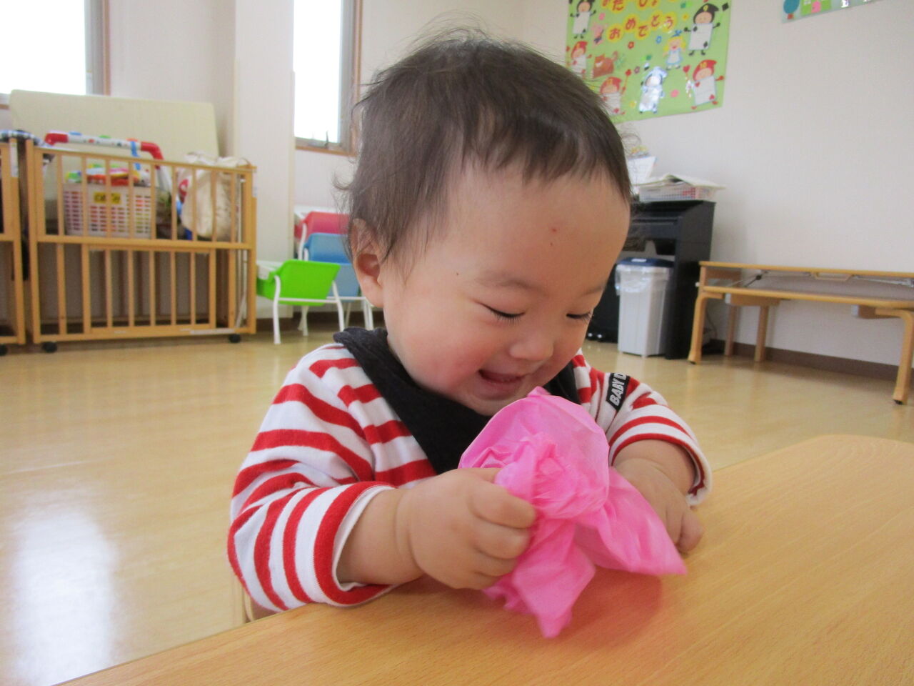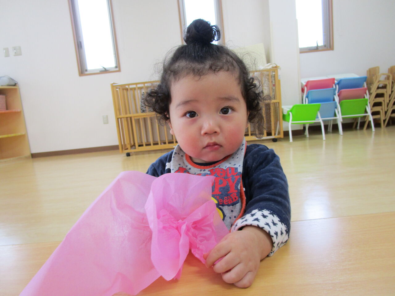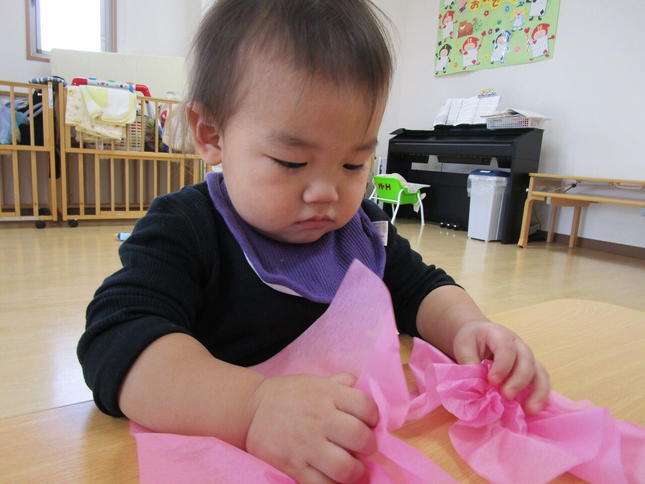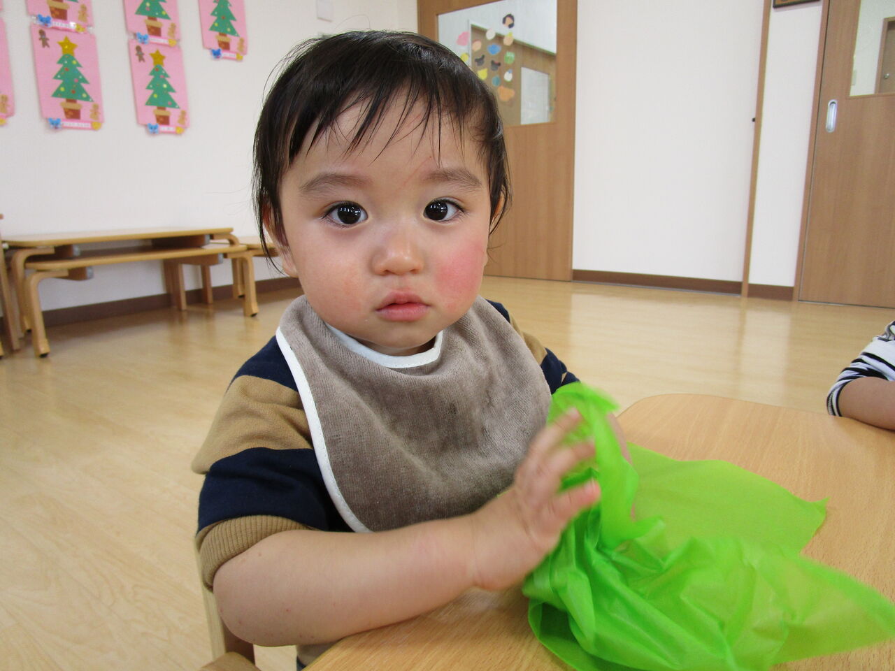 のねずみ組♡クリスマス製作 2019年12月31日 こんにちは今日は、クリスマス製作の様子をお伝えしたいと思います リースは、花紙をクシャクシャに丸めて、袋に入れますクシャ・クシャギュッ・ギュ僕上手にできているかなちょっと触るの怖いな上手にできました美味しそうで、ついつい口元に・・・ 袋に入れたら、点シールをペタペタ貼って、可愛いリースを作ることが出来ました 今年のブログ更新は、今回で最後になります楽しんで頂けましたでしょうか来年も可愛いみんなの様子を伝えていきたいと思います。新年もよろしくお願いします