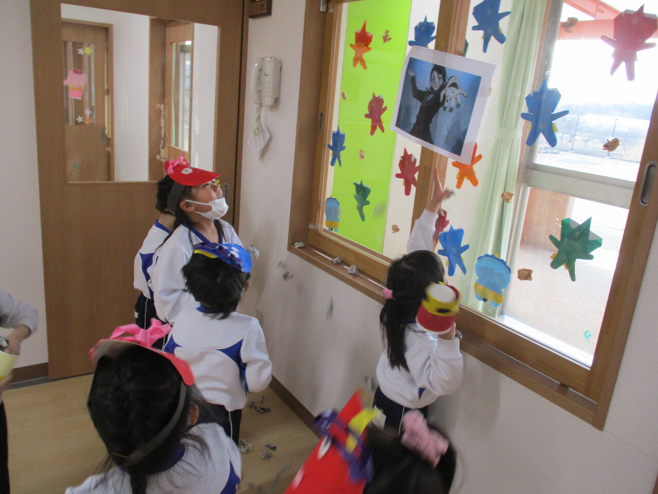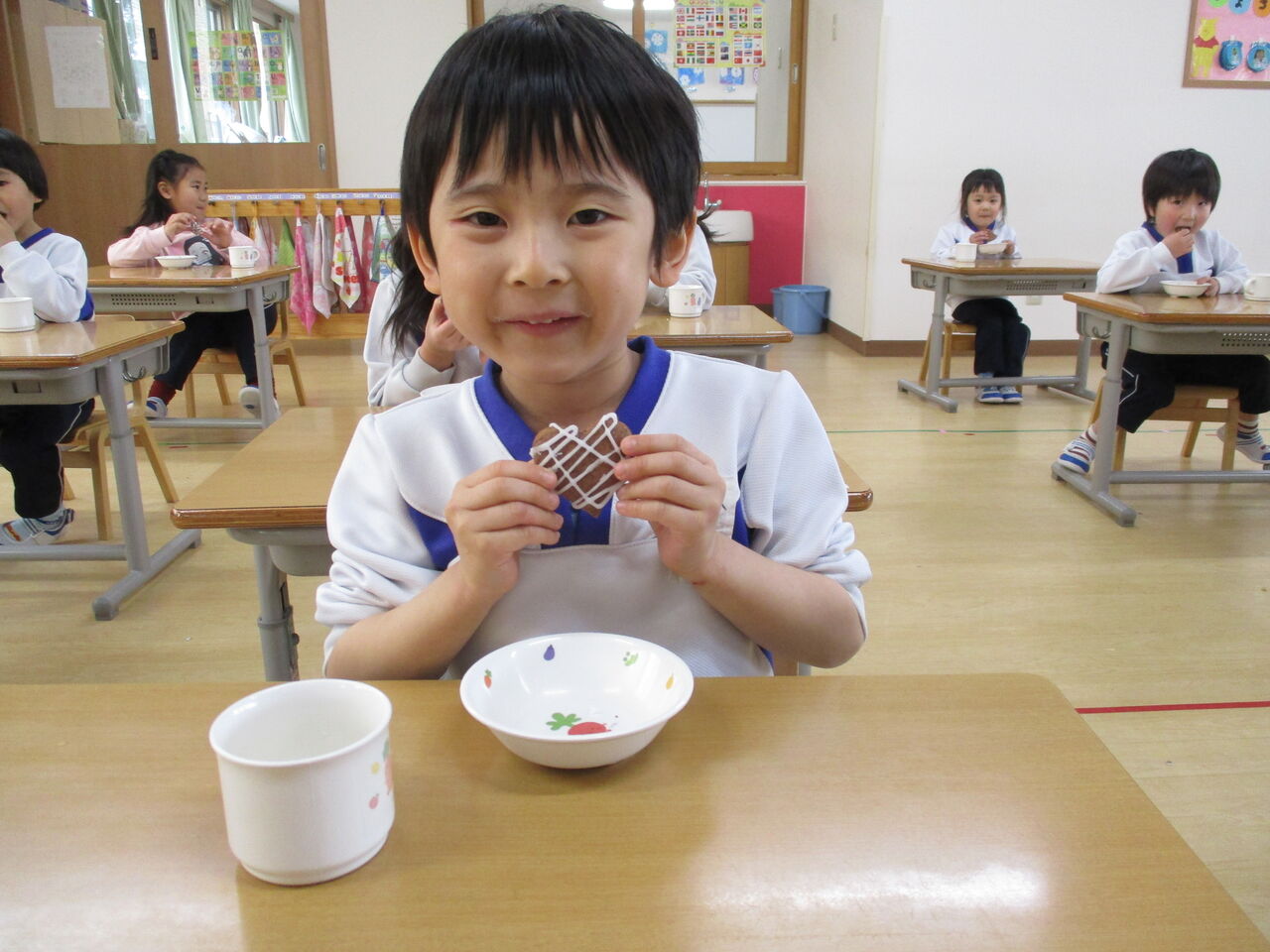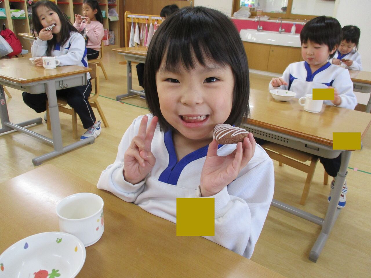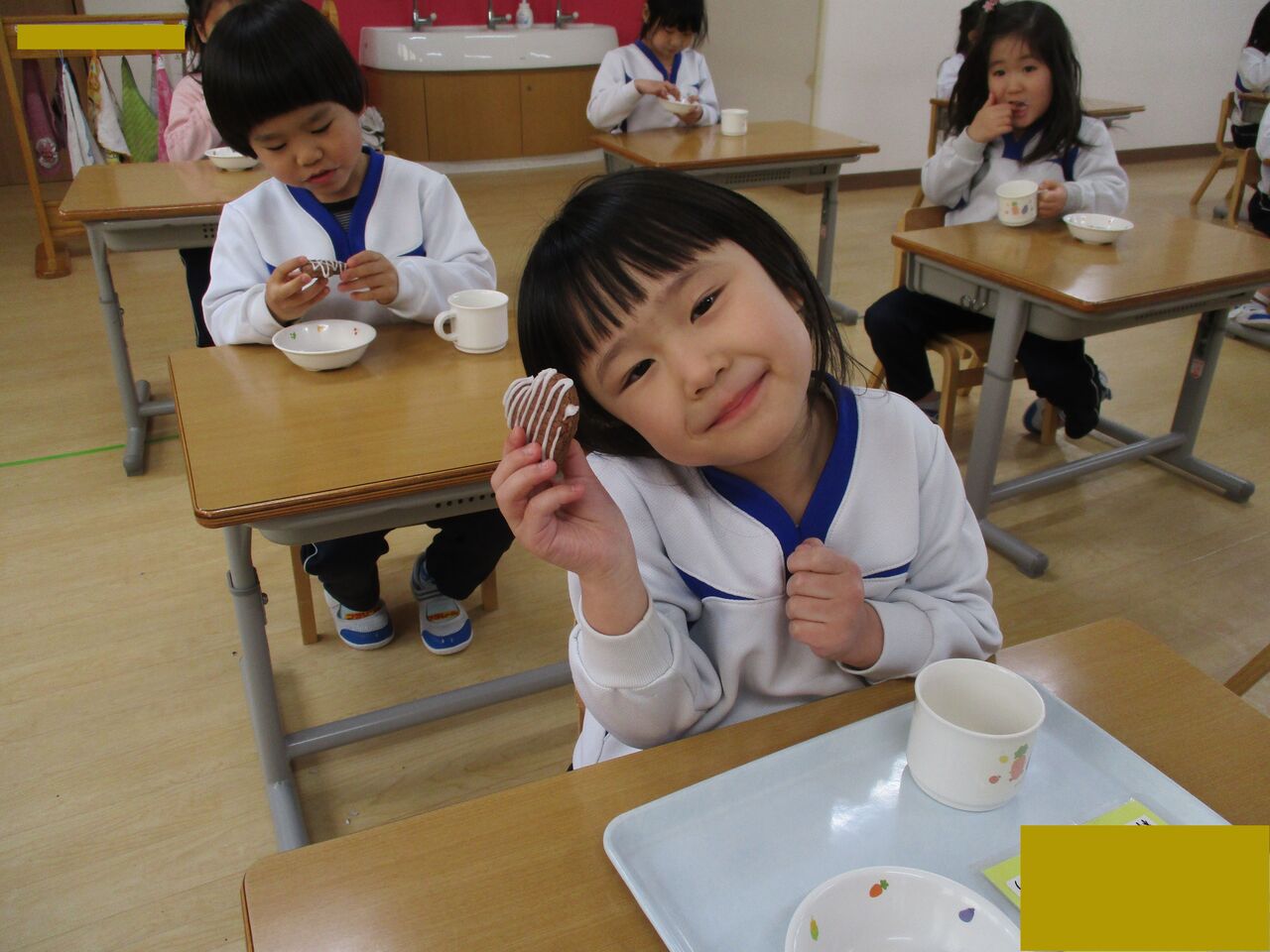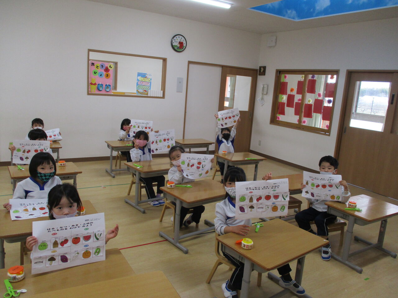 きつね組♡2月の様子 2021年03月05日 こんにちは今回は2月のきつね組の様子をお伝えします まず節分の豆まきの様子から今年は鬼滅の刃の鬼に向かって投げました 次におやつの様子この日はバレンタインデーメニューでハートのクッキーが出ました♡の形に大喜びでした美味しかったね 次は食育に付いてお伝えします春・夏・秋・冬の旬の食べ物について皆で考えましたクイズ形式で季節の食べ物を分けました楽しく出来ました最後にみんなでポーズ次回もお楽しみに~~~