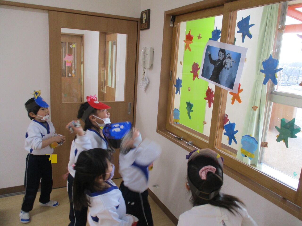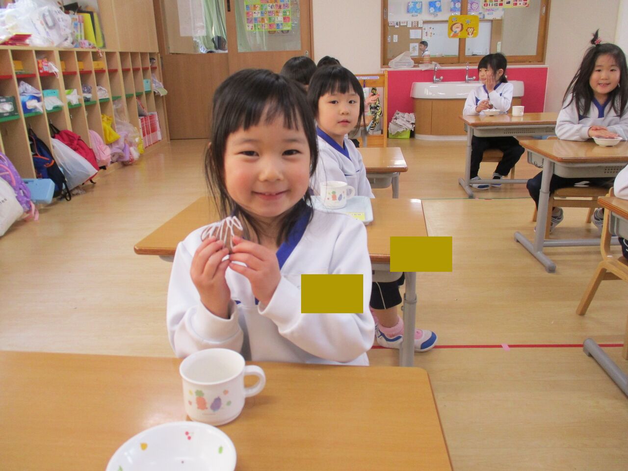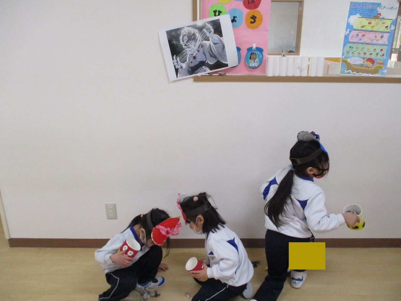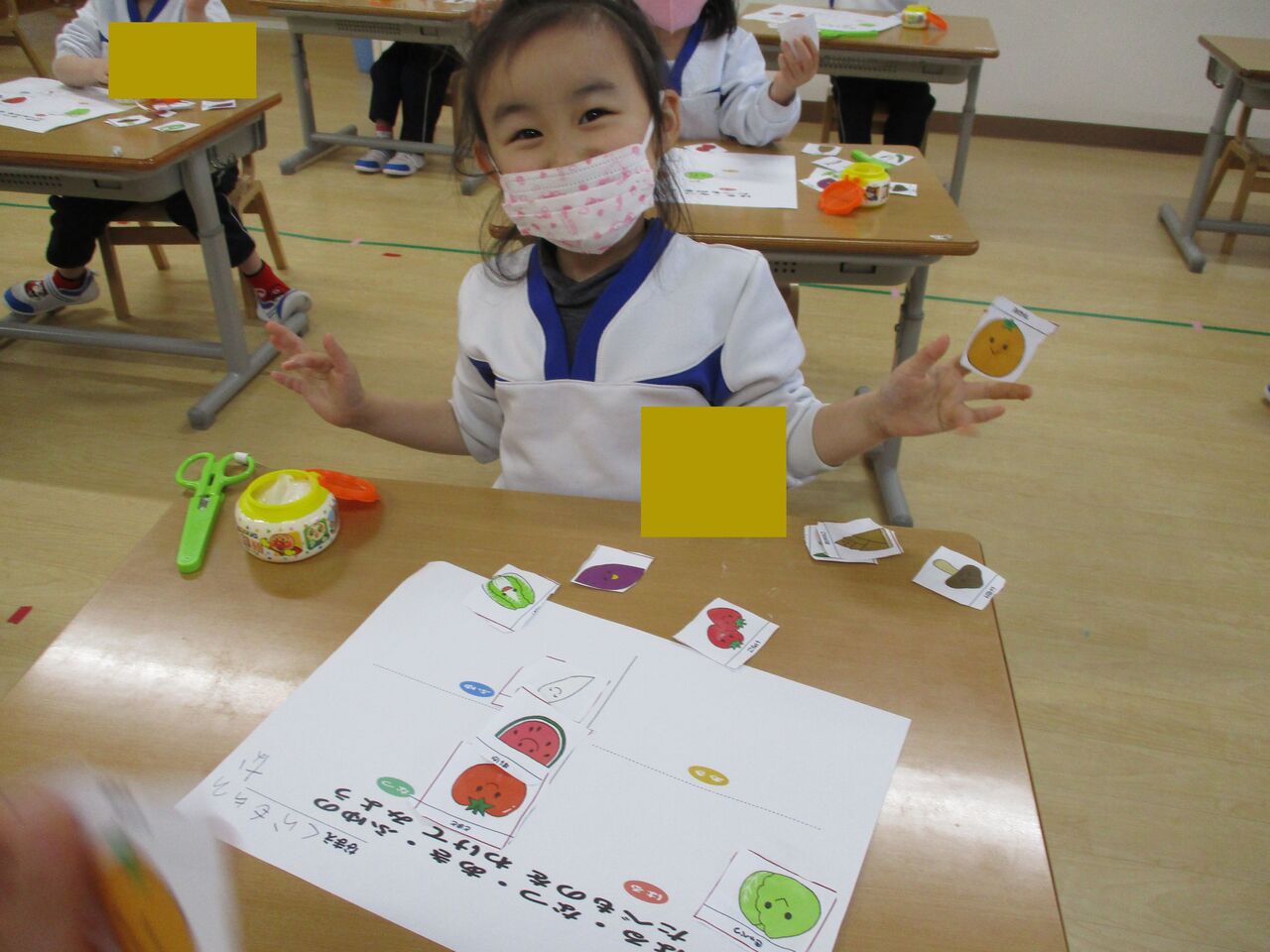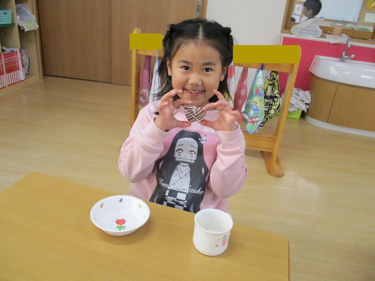 きつね組♡2月の様子 2021年03月05日 こんにちは今回は2月のきつね組の様子をお伝えします まず節分の豆まきの様子から今年は鬼滅の刃の鬼に向かって投げました 次におやつの様子この日はバレンタインデーメニューでハートのクッキーが出ました♡の形に大喜びでした美味しかったね 次は食育に付いてお伝えします春・夏・秋・冬の旬の食べ物について皆で考えましたクイズ形式で季節の食べ物を分けました楽しく出来ました最後にみんなでポーズ次回もお楽しみに~~~