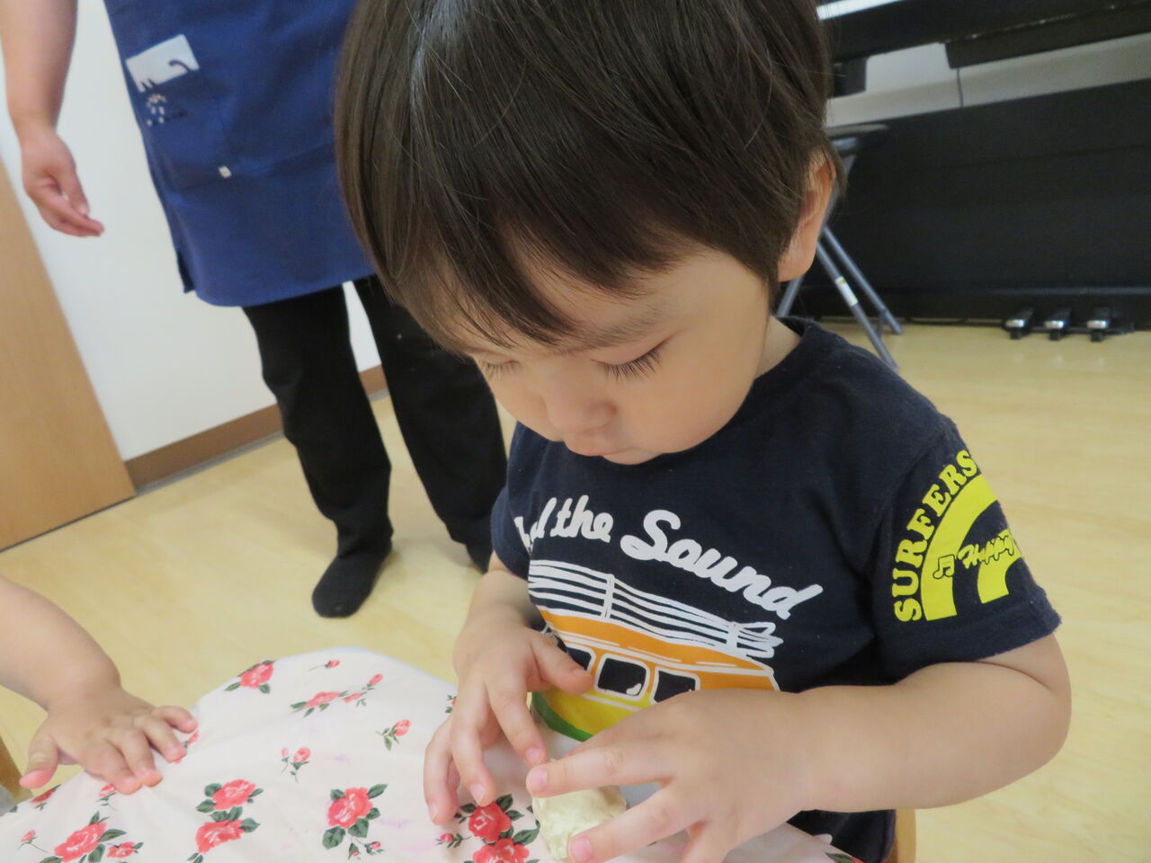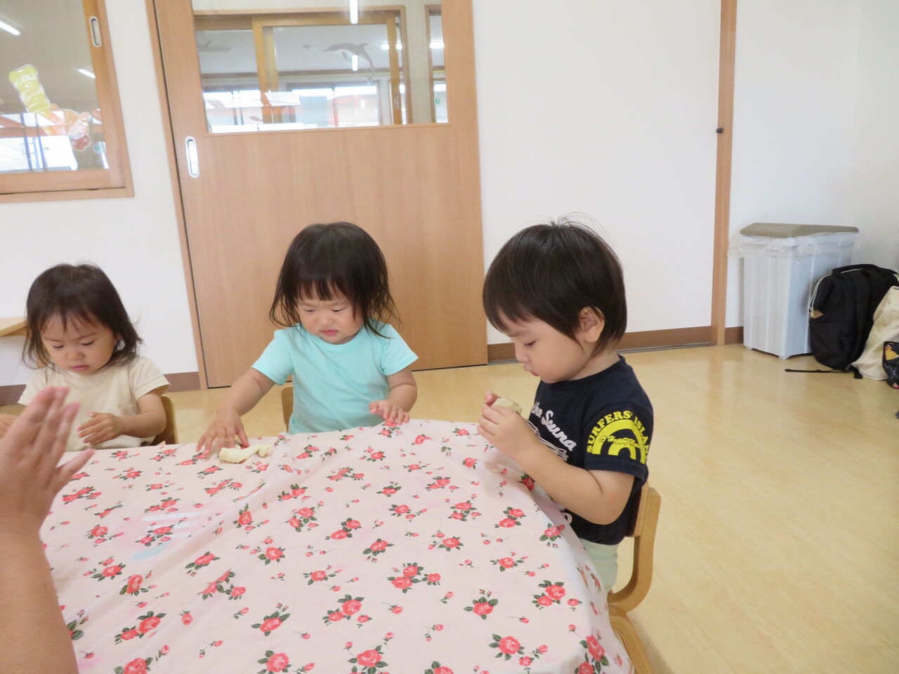 りすぐみ♡小麦粉粘土 2022年07月21日 「小麦粉粘土」で遊んだ時の様子をご覧ください初めての小麦粉粘土遊びです先生がコネコネして作っている姿をじーっと見つめます「早く触ってみたーい」と、手を伸ばすお友だちもたくさんいましたおそるおそる触ってみます、、、、、慣れてくると両手で触れるようになってきました また小麦粉粘土であそぼうね 〈おまけ〉 ブロック遊び電話を作ってもらったよ「もしもーし」絵の具の製作上手にできました七夕の製作 飾ってくれたかな また次回のブログもお楽しみに~