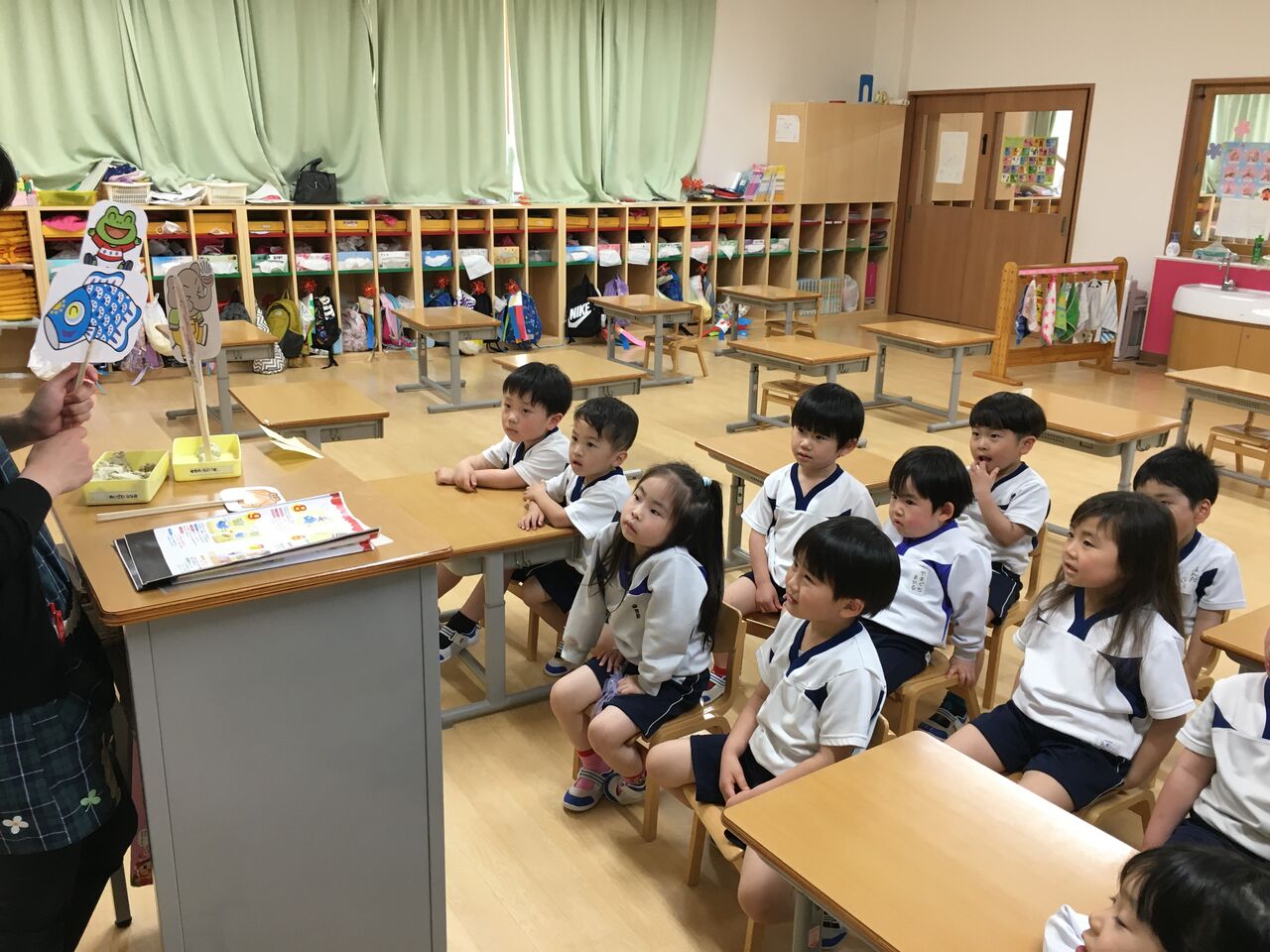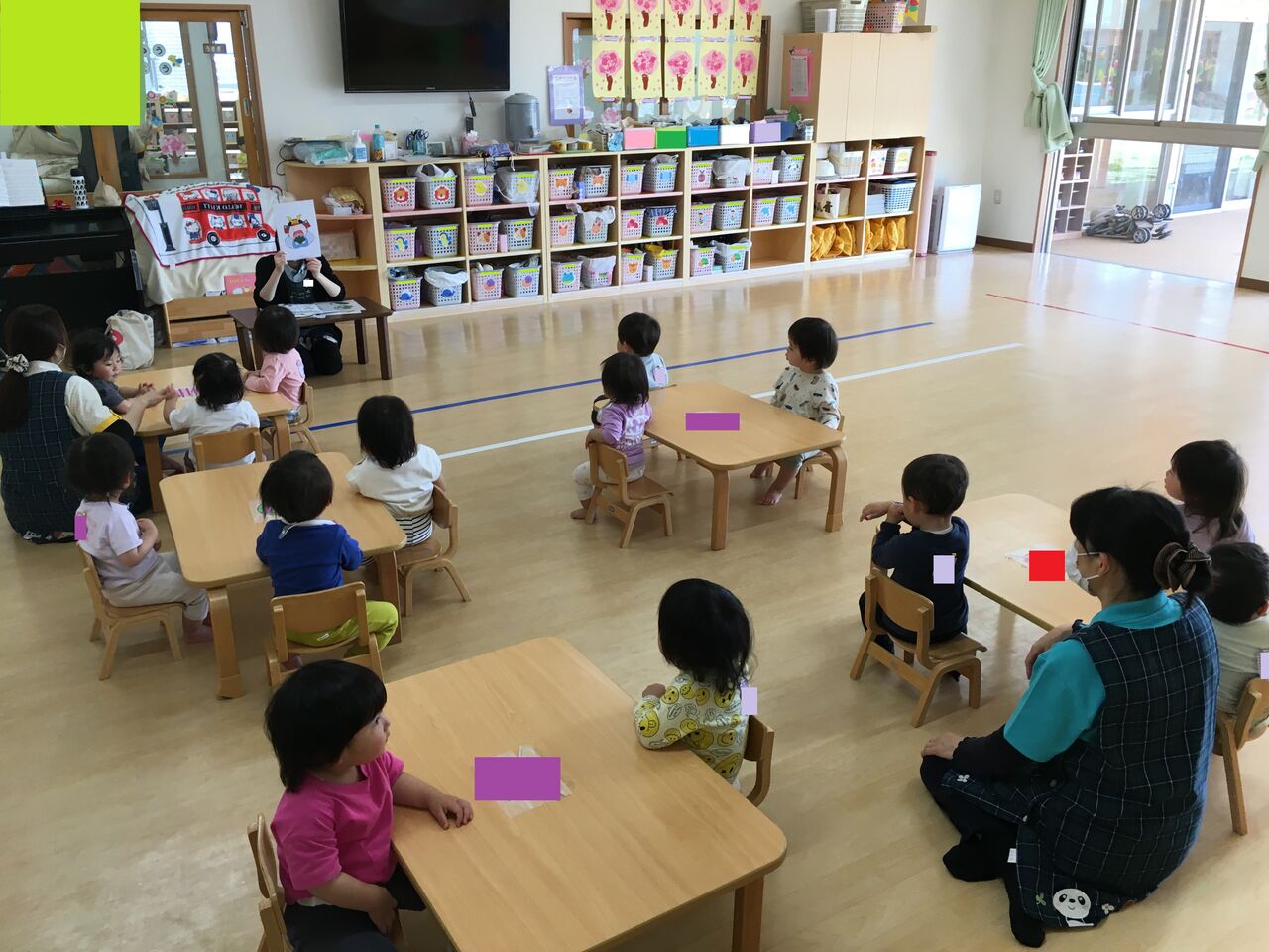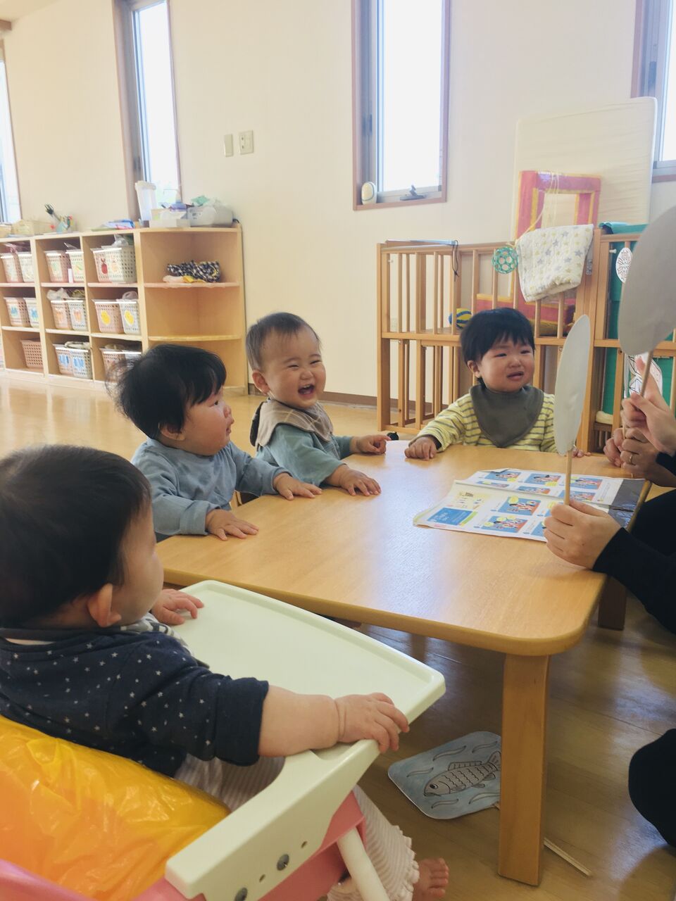 こいのぼり祝会の様子☆ 2023年05月01日 今回は4月28日に行われた「こいのぼり祝会」の様子をお届けいたします未満児は「こいのぼりのひみつ」以上児は「遊ぼう!こいのぼりくん」のペープサートを各クラスでみています。 0歳児出てきたこいのぼりを見て満面の笑みです 1歳児 集中しています 2歳児一緒に考えています。わかったかなぁ~・・・ 3歳児真剣な表情ですねぇ・・・ 4歳児 おもしろいなぁ~ 5歳児こいのぼりと遊ぶには・・・?なるほどぉ・・・ 各クラス様々な表情を見せてくれました。子どもの日のクイズもあり楽しく過ごすことができました