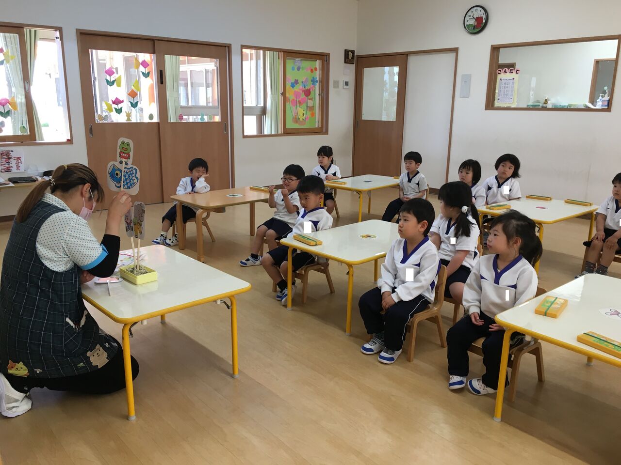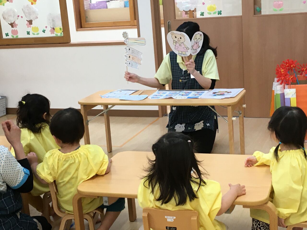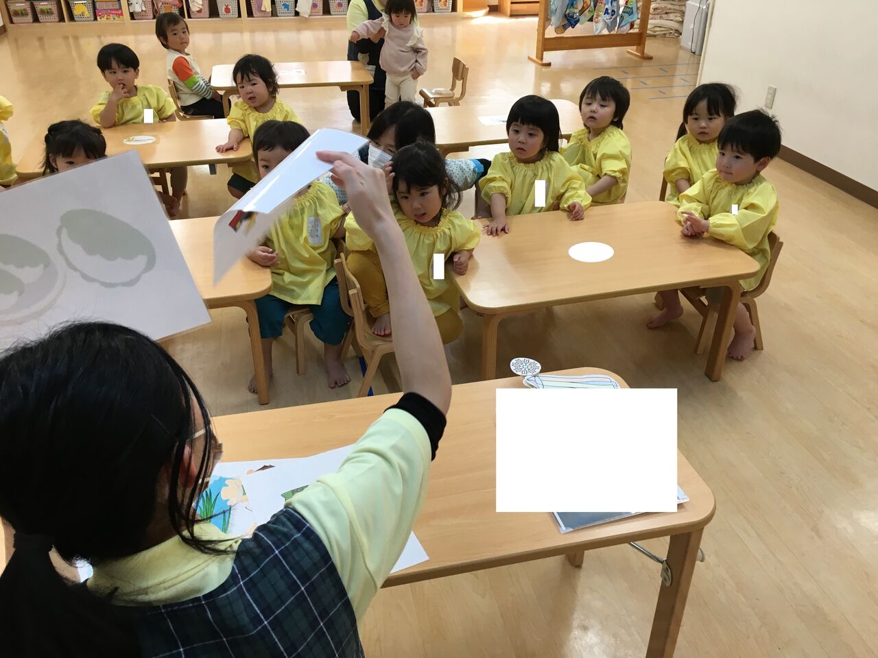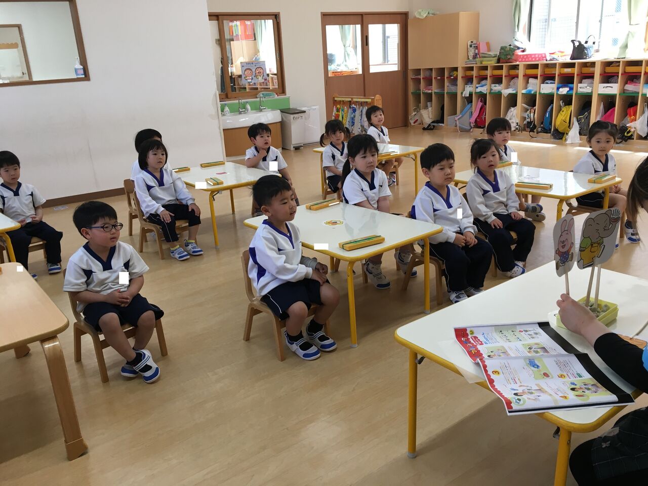 こいのぼり祝会の様子☆ 2023年05月01日 今回は4月28日に行われた「こいのぼり祝会」の様子をお届けいたします未満児は「こいのぼりのひみつ」以上児は「遊ぼう!こいのぼりくん」のペープサートを各クラスでみています。 0歳児出てきたこいのぼりを見て満面の笑みです 1歳児 集中しています 2歳児一緒に考えています。わかったかなぁ~・・・ 3歳児真剣な表情ですねぇ・・・ 4歳児 おもしろいなぁ~ 5歳児こいのぼりと遊ぶには・・・?なるほどぉ・・・ 各クラス様々な表情を見せてくれました。子どもの日のクイズもあり楽しく過ごすことができました