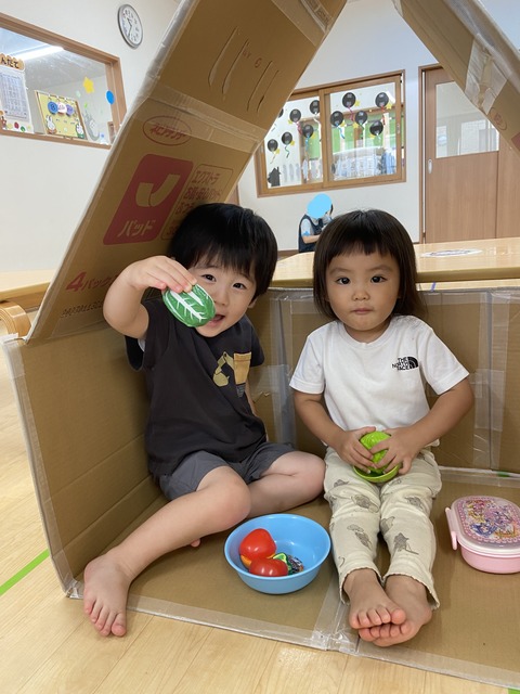 ☆うさぎぐみ 8月の様子☆ 2023年09月25日2023年08月22日 毎日厳しい暑さですが、子ども達は元気いっぱいです! 8月はうさぎ組のみんなが楽しみにしていた夏祭りもありました そんな子ども達の8月の様子をお伝えします ♡おままごと遊び♡ 牛乳パックで作った椅子に座ってお友達と仲良くお茶会をしたり、お弁当箱やお皿に食べ物をのせたり「いらっしゃいませ~!」とお店屋さんごっこをしたりと楽しく遊びました ♡夏祭り給食♡ 焼きそばやトウモロコシなど、お祭りならではのメニューに子ども達は大喜びであっという間に食べ終わってしまいました ♡栗製作♡ 初めてのフォークスタンプ 初めはどう使うのか戸惑っていましたが、慣れてくると上手にスタンプすることが出来ました 栗にも顔を描きました 目や口を描くのがとても上手になってきました ♡折り紙製作♡ 初めて折り紙を使った製作をしました 折り紙が配られると「早くやりたい!」「これどうやるんだ ろう!?」と興味津々な様子でした 丸いシールをペタペタ 完成 ~ ♡夏祭り♡ お揃いの帽子を被ってクレープ屋さんを開きました 元気よく「いらっしゃいませ~!」と上手に店員さんになりきるうさぎ組さんでした 来月のブログもお楽しみに~